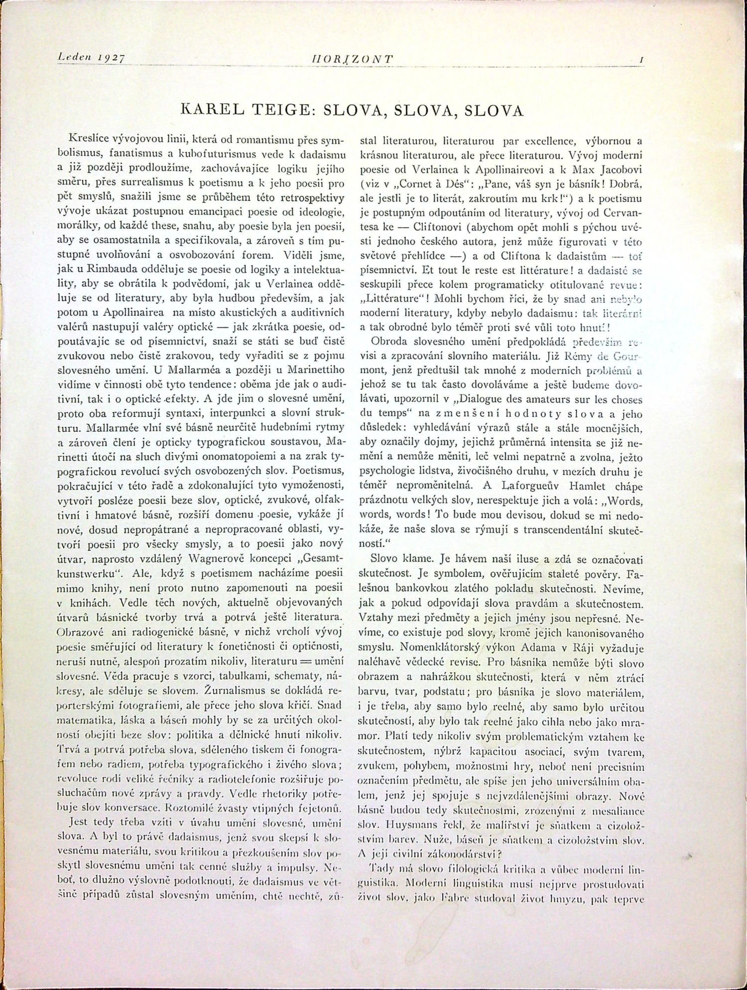 Horizont. Revue současné kultury v Československu. Číslo 1. Ročník I.