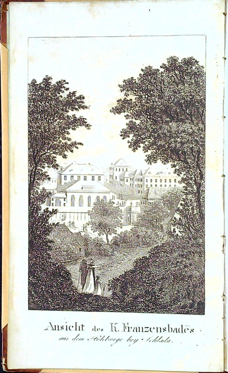 Hirsch III,307; Voit "Bohemica" 353; BCBT 08675<br> Tištěno antikvou, ve front. lept (126 x 80 mm) s pohledem na Františkovy Lázně a rytým nápisem "Ansicht des K. Franzensbades aus dem Hohlwege bey Schlada". Na konci knihy vyklápěcí plán, lept (130 x 310 mm) se schematickým vyobrazením léčebných pramenů a rytým nápisem "Situationsplan von der Anlage des Kaiserfranzensbades", sign.: "Jo. Berka sc.". Mezi stranou 42-43 rozkládací tabule.<br>Dobová kartonová vazba s koženým hřbetem a nárožnicemi, ve druhém poli hřbetu dobový kožený štítek s tlačeným a zlaceným názvem, jednotlivá pole hřbetu členěná dvojitou tlačenou a zlacenou linkou, zeleně barvené ořízky. Na předním přídeští nalepeno staré ex libris "Leipziger Stadtbibliothek", na tit. listu razítko lipské universitní knihovny a razítko "neplatné", na straně 99 při dolním okraji razítko stejné instituce. Front. zčásti uvolněný od knižního bloku, plán při vnitřním okraji u hřbetu lehce zašpiněný.<br>Josef Karel Eduard Hoser (30.1. 1770 Ploskovice - 22.8. 1848 Praha), lékař, botanik a národopisec. Lékařskou praxi provozoval v Praze a byl osobním lékařem arcivévody Karla.