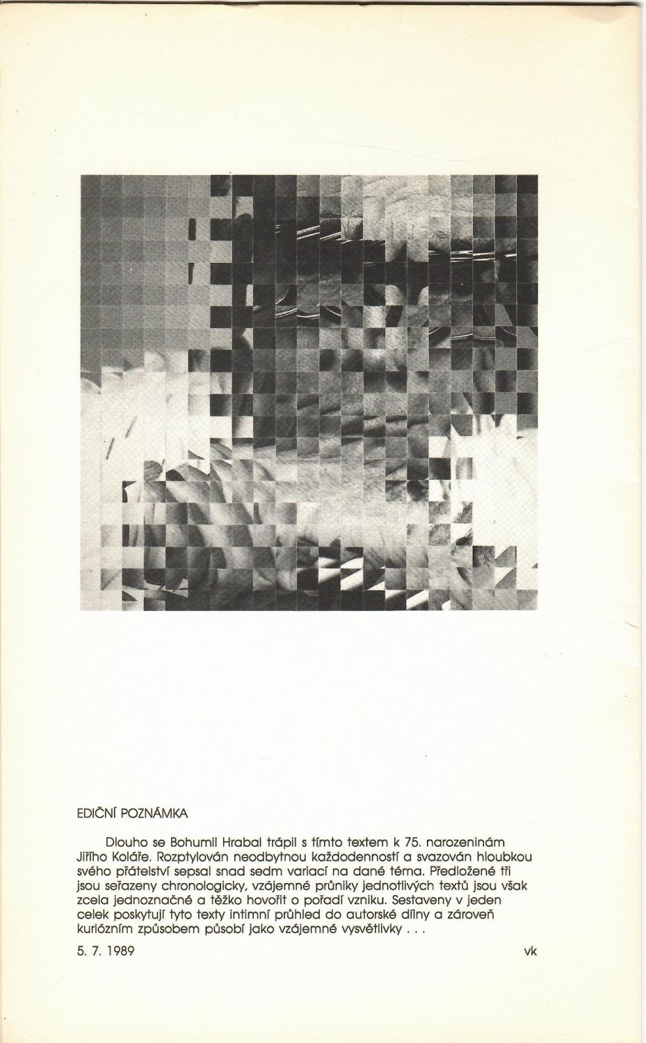 Vydáno jako příležitostný tisk k 75. narozeninám Jiřího Koláře v září 1989. - Původní obálka z tužšího papíru s chlopněmi, ve které je volně vložený složený knižní blok. - Obálka místy lehce zahnědlá.