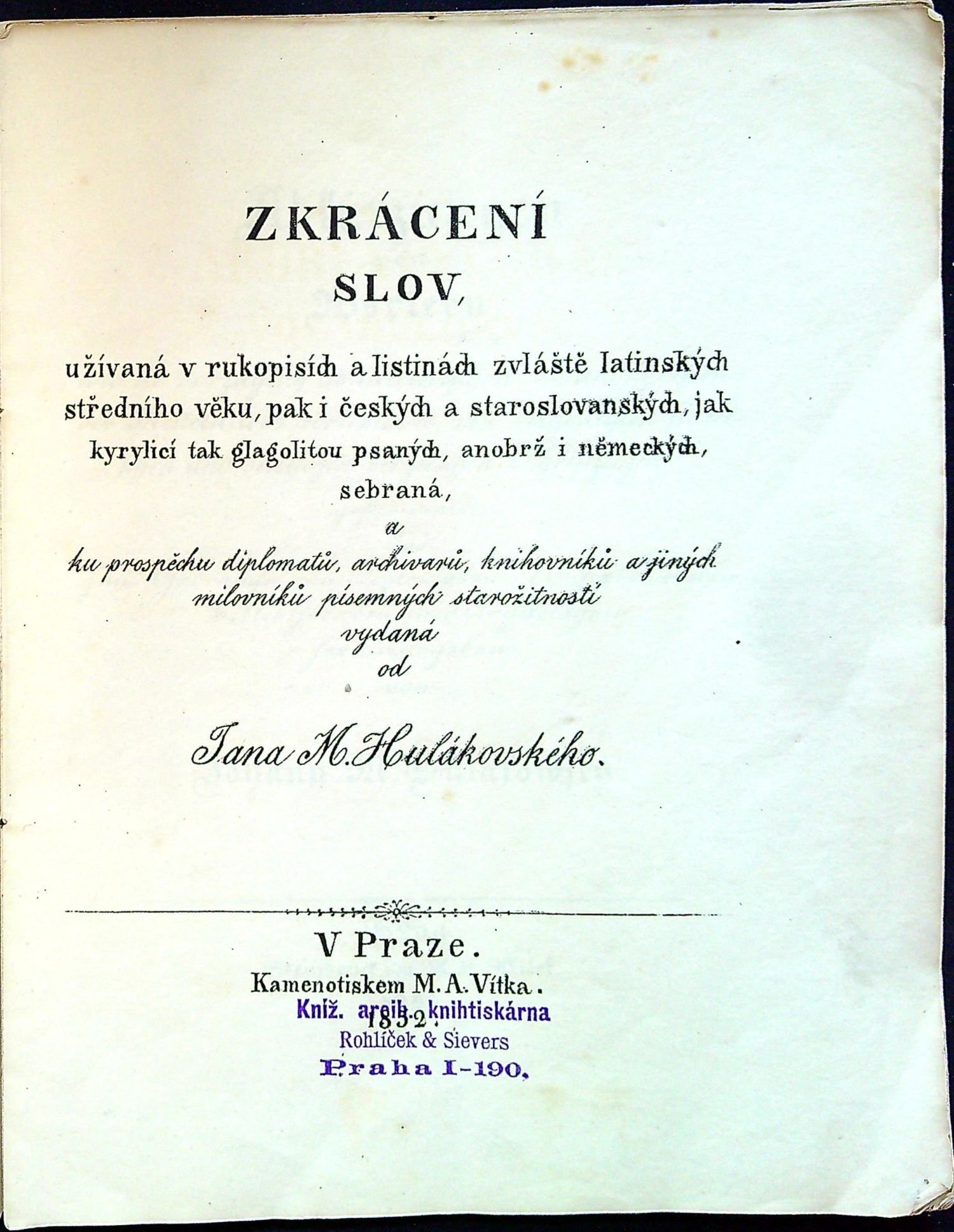Abbreviaturae vocabulorum. Zkrácení slov, užívaná v rukopisích a listinách zvláště latinských středního věku, pak i českých a staroslovanských, jak kyrylicí tak glagolitou psaných, anobrž i německých, sebraná, a ku prospěchu diplomatů, archivarů, knihovníků a jiných milovníků písemných starožitností vydaná od Jana M. Hulákovského.