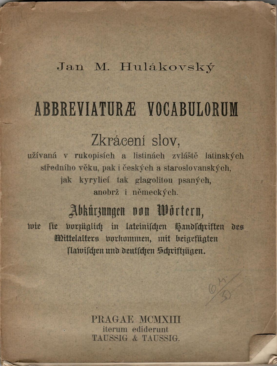 Abbreviaturae vocabulorum. Zkrácení slov, užívaná v rukopisích a listinách zvláště latinských středního věku, pak i českých a staroslovanských, jak kyrylicí tak glagolitou psaných, anobrž i německých. Abkürzungen von Wörten, wie sie vorzüglich in lateinischen Handschriften des Mittelalters vorkommen, mit beigefügten slawischen und deutschen Schriftzügen.