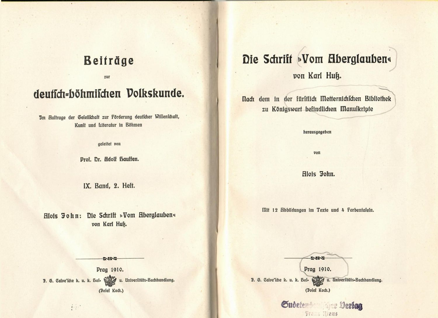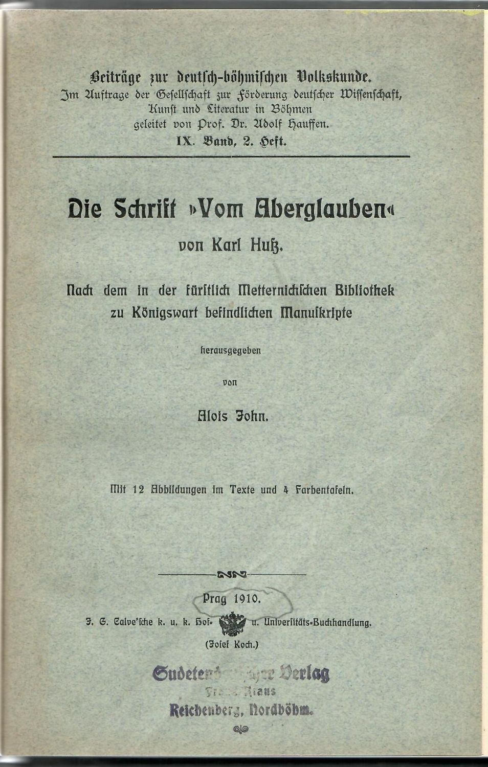 Tištěno švabachem, na úvodní příloze černobílá reprodukce portrétů Karla Hussa a jeho manželky, na další příloze vyobrazení chebské katovny. - Černá plátěná vazba s tlačeným a zlaceným názvem ve hřbetu, původní pap. obálka vevázána, na líci předtitulu podpis tužkou Jiřího Šalamouna a jeho poznámka adresovaná knihvazači.<br>Karel Huss (3.1. 1761 Most - 19.12. 1838 Kynžvart), byl český (sudetoněmecký) kat a sběratel. Narodil se v české katovské rodině a přestože se rodina snažila, aby nemusel vykonávat rodinné řemeslo, stal se nakonec také katem. Roku 1781 byl v Chebu jmenován městským katem. Byl velmi zvídavý, ovládal latinu, zajímal se o botaniku, od otce, který byl i výborným zvěrolékařem se naučil přípravě různých léčivých nápojů a mastí a věnoval se též léčitelství. Věnoval se také historii a byl velkým znalcem historie města Chebu. Sbíral starožitnosti, minerály, mince. knihy, rukopisy .... Své sbírky zpřístupnil, v budově katovny vzniklo malé muzeum, které navštívil i J. W. Goethe, s kterým se Huss spřátelil a na jeho popud začal psát knihu o pověrách. Po smrti své ženy nabídl svoji sbírku městu Cheb, které však neprojevilo zájem. O sbírku projevil zájem kníže Metternich a roku 1828 byla převezena do jeho zámku v Kynžvartu, kde se Huss stal správcem a kustodem jednoho z prvních zámeckých muzeí ve střední Evropě.