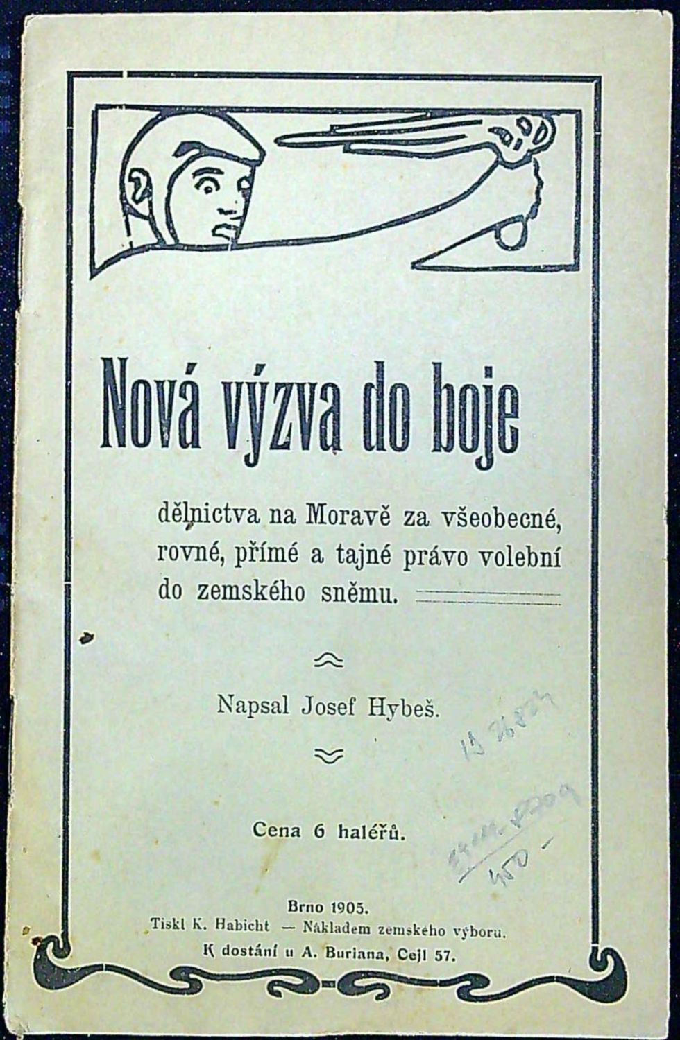 Na přední straně obálky v záhlaví ilustrace s vyobrazením bojovníka (F. Gellner ?), na zadní číslované straně obálky text a koncová vinětka.<br>Josef Hybeš (29.1. 1850 Dašice - 19.7. 1921 Brno) politik a novinář. Jeden z prvých sociálně-demokratických poslanců Říšské rady ve Vídni, po vzniku republiky poslancem Revolučního národního shromáždění a Národního shromáždění ČSR, v závěru svého života se přiklonil ke vzniklé Komunistické straně ČSR. Spoluzakladatel prvního esperantského klubu na území českých zemí a celé rakousko-uherské monarchie.