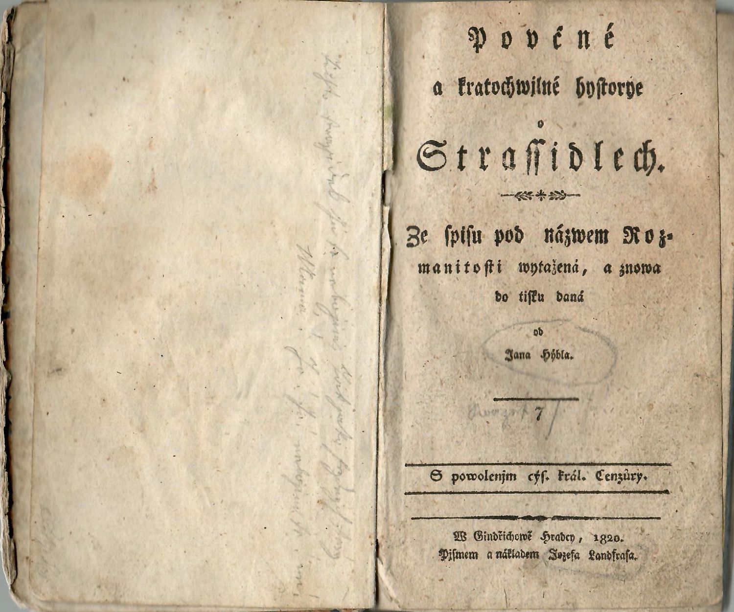 SKC eviduje několik exemplářů s odlišným počtem stran (94 či 95). <br>Tištěno švabachem, signatury, stránkové kustody, mizící linky, v úvodu předmluva Hýblova (str. III-IV), následuje dedikace "Wssem na rozum uhozeným wysoce powěrčliwým Babičkám po celém králowstwj Českém a markrabstwj Morawském obětuge tato strassidla Wydawatel" (str. V-XIV - správně XVI), předmluva a dedikace tištěna odlišným a větším typem písma. Kromě Hýbla jsou v textu příspěvky od Josefa Lindy, Václava Horomíra Špinky, Adama Šajnosta. Na posledních třech nečíslovaných stranách seznam Landfrasem nabízených knih.<br>+ přívazek: "Frydrych a Amalie, dwau stracených a opět nalezených dětj welmi podiwný přjběhowé", Chrudim, bez udání nakladatele, 1810, 114 stran, tištěno švabachem, signatury, stránkové kustody, arabská paginace stran uprostřed horního okraje mezi jednoduchými a krátkými vlnovkami, mizící linky. - Papír místy lehce zahnědlý, strany 39-46 při spodním okraji mírně natržené a s chybícími malými kousky papíru (bez zásahu do textu).<br>Dobová kartonová vazba potažená mramorovaným papírem, ohmataná a místy odřená, ve hřbetu natržená, naražené rohy. Na přední předsádce podpisy tužkou J. Šalamouna a W. Koreise (?). (SKC eviduje pouze jeden exemplář ve Studijní a vědecké knihovně v Hradci Králové).