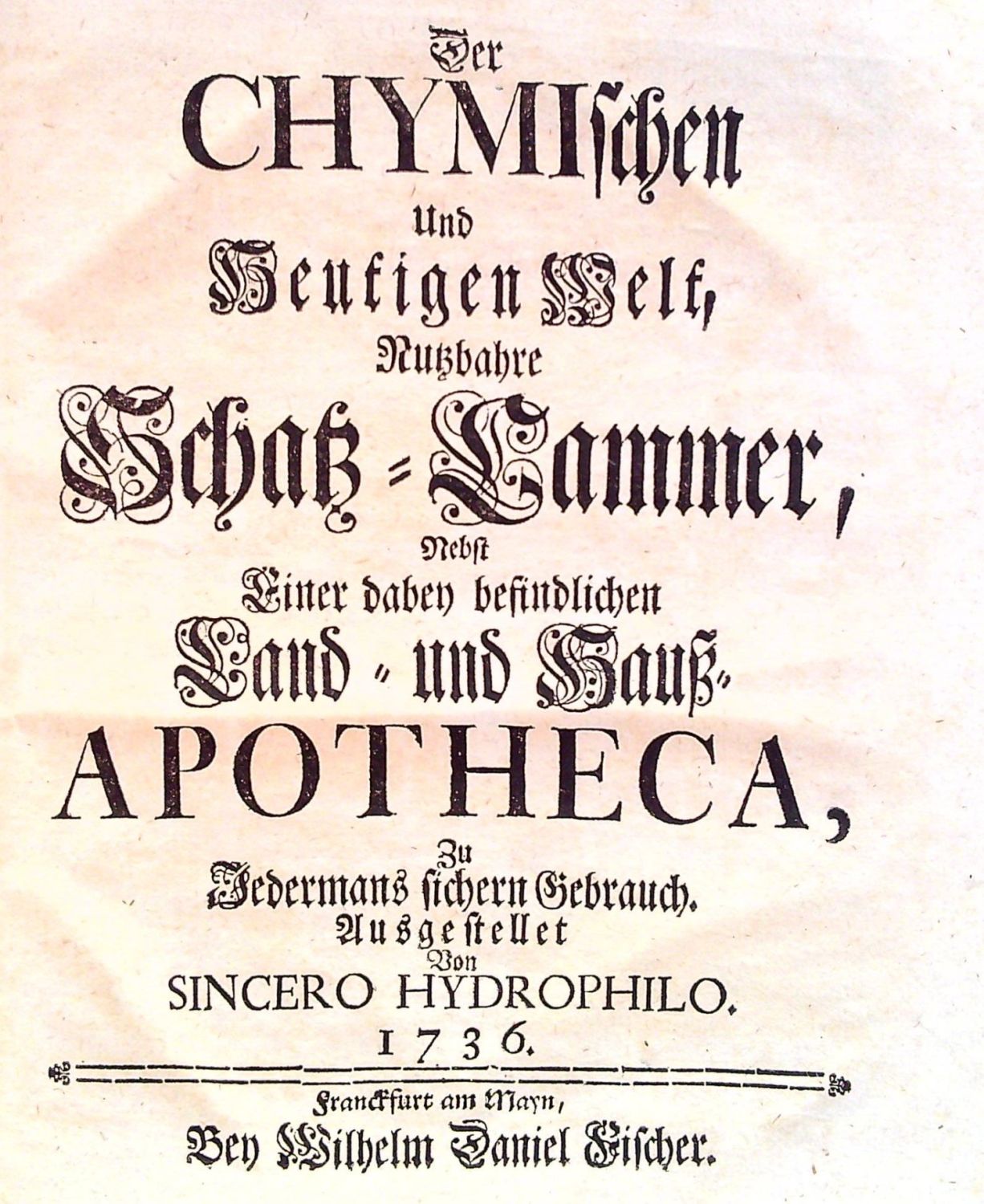 Der Chymischen und Heutigen Welt, Nutzbahre Schatz-Cammer, Nebst einer dabey befindlichen Land- und Hauss-Apotheca, zu jedermans sichern Gebrauch.