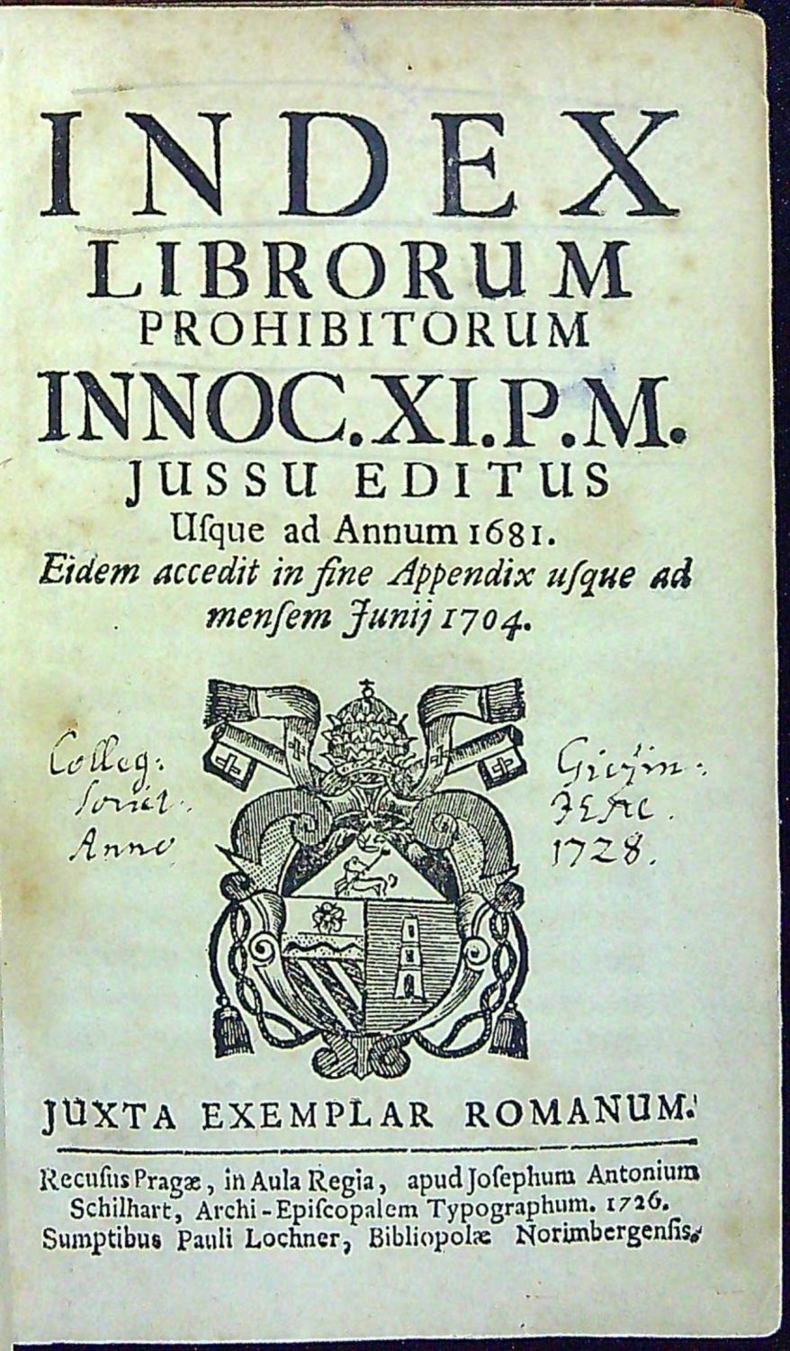 INDEX LIBRORUM PROHIBITORUM INNOC. XI. P.M. JUSSU EDITUS Usque ad Annum 1681. Eidem accedit in fine Appendix usque ad mensem Junij 1704.