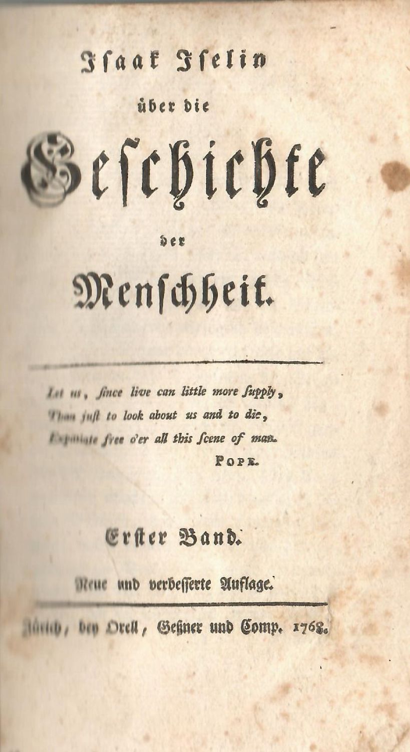 Tištěno švabachem, latinský text antikvou. Arabská paginace stran uprostřed horního okraje mezi obrácenými kulatými závorkami, tištěné poznámky pod čarou.<br>Dobová vazba s deskami potaženými olejovým papírem, koženým hřbetem a nárožnicemi, ve hřbetu 5 vazů, ve druhém poli kožený štítek s tlačeným a zlaceným názvem, v ostatních polích olemovaných linkami tlačený a zlacený rostlinný ornament, mramorované ořízky, na přídeštích a předsádkách dobový tragantový papír zdobený rostlinným ornamentem. Vazba mírně ohmataná, lehce naražené rohy, při horním okraji hřbetu natržená s chybícím kouskem kůže. Na předním vakátu staré, nevyplněné knih. razítko.<br>Isaak Iselin (7.3. 1728 Basilej - 15.7. 1782 Basilej), významný švýcarský filosof se zaměřením na historii a politiku, filantrop a osvícenec. Roku 1756 se radním v Basileji. Byl také spoluzakladatelem Helvétské společnosti. Nabízená kniha vyšla poprvé roku 1764 a patří k prvním důležitým dějinám lidstva v německém jazyce.