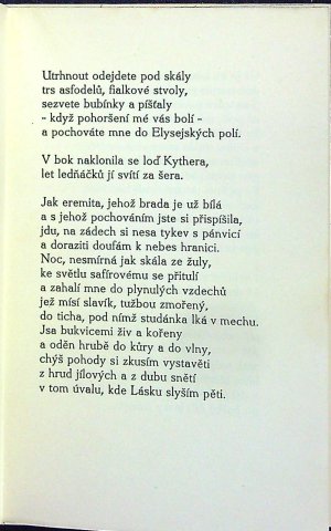 Jeden ze 150 nečíslovaných exemplářů (krom toho vyšlo 50 číslovaných tištěných na ručním papíře), písmem Cicero Hayduk vytiskl Karel Kryl v Kroměříži. Přeložil B. Reynek. Původní pap. obálka s chlopněmi, ve které je volně vložený knižní blok a lepty. Na přední straně obálky viněta. Knižní blok nerozřezaný.