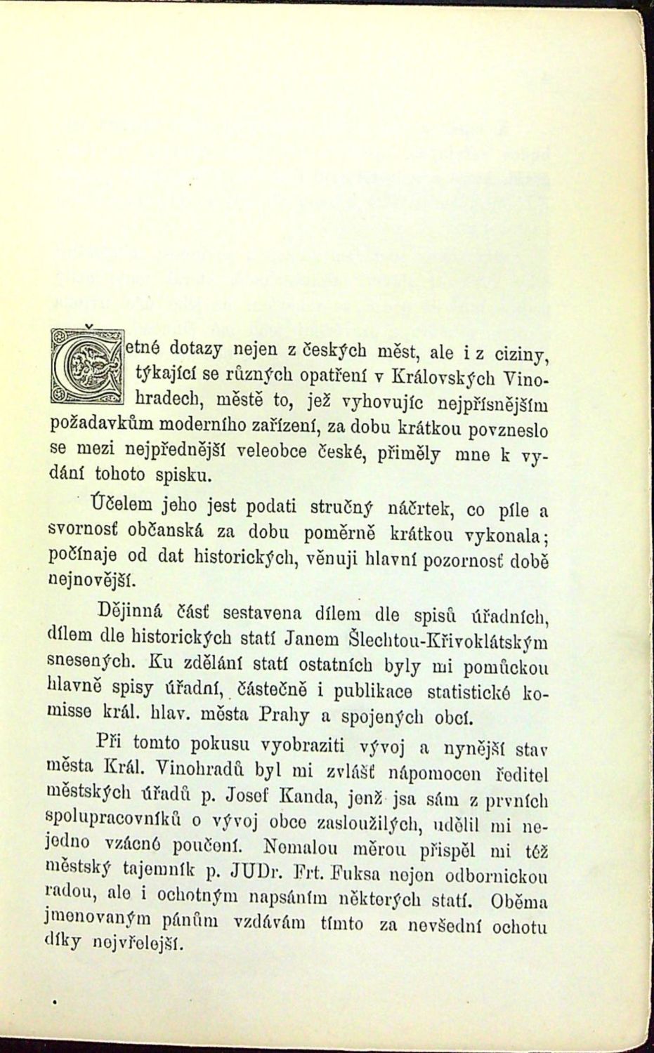 Na tit. listu znak Král. Vinohrad, konturové iniciály na ornamentálním pozadí zalomené do výše 3-4 řádků, v textu fotograf. vyobrazení různých vinohradských pamětihodností, za paginovanou částí mezititul "Seznam domů a ulic města Král. Vinohradů" a na dalších 36 nepag. listech seznam celkem 860 domů s uvedením jejich majitele. Na konci rozkládací plán města Král. Vinohrad. Mezi str. 56-57 rozkl. příloha se sazbou hřbitovních poplatků.<br>Dobová plátěná vazba, na přední desce tlačený název a tlačený, zlacený znak města, vazba ohmataná, zlacení znaku vybledlé, několik posledních listů uvolněných z knižního bloku.