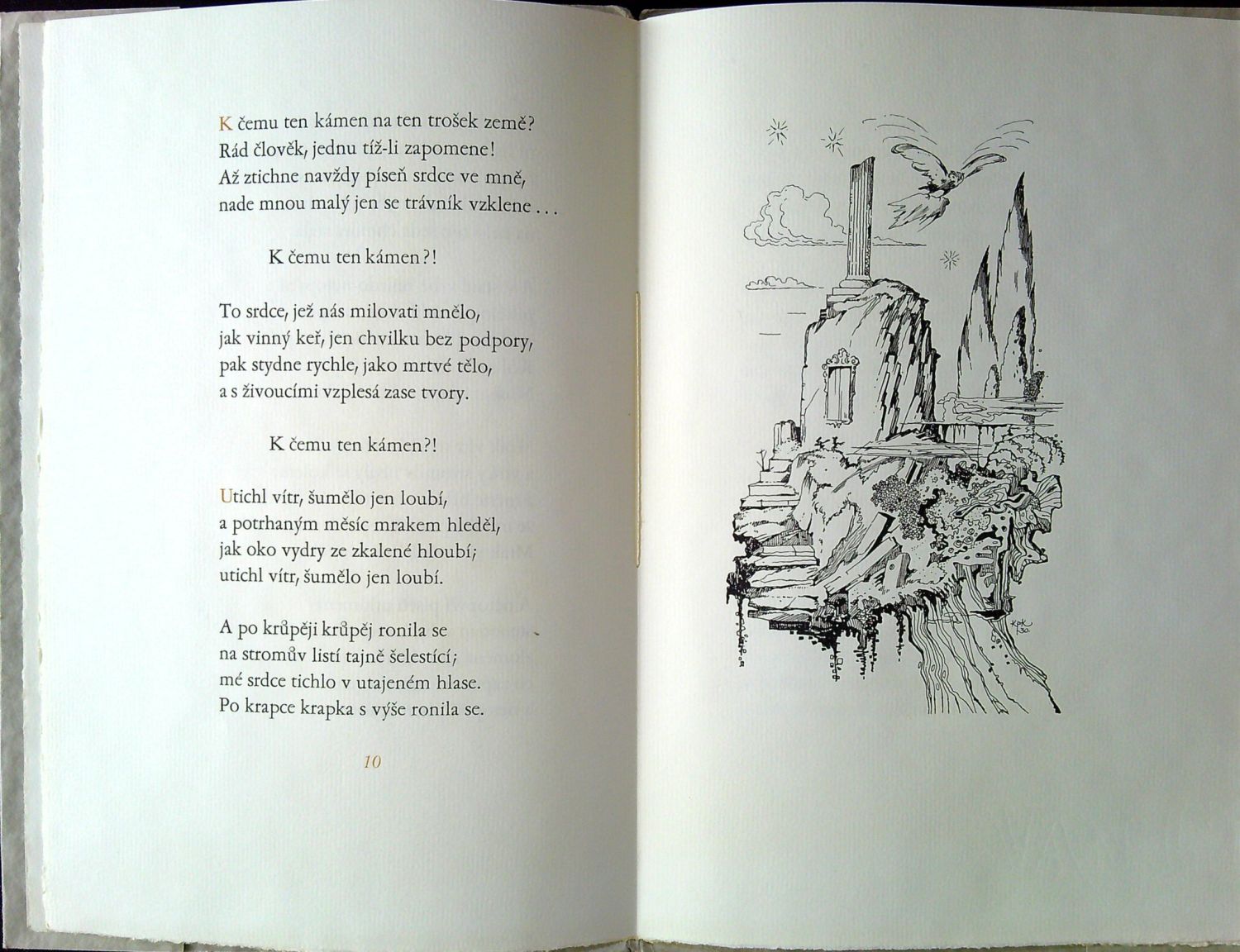 Exemplář č. 211 z 250 vydaných výtisků tištěných písmem Claude garamond na holandský ruční papír Van gelder. Cyklus básní Bohdana Jelínka z rukopisu připravil Dr. František Páta.<br>