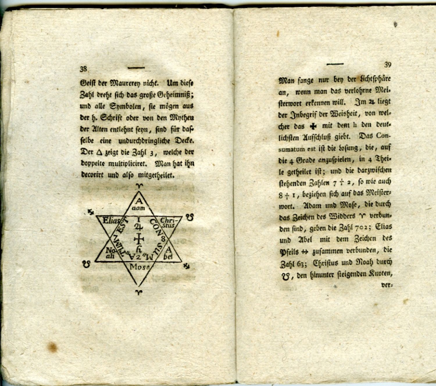 | Ilustrace: | Na tit. listu zednářský symbol, na str. 38 dřevořezový hexagram, uprostřed horního okraje stran krátká linka. |