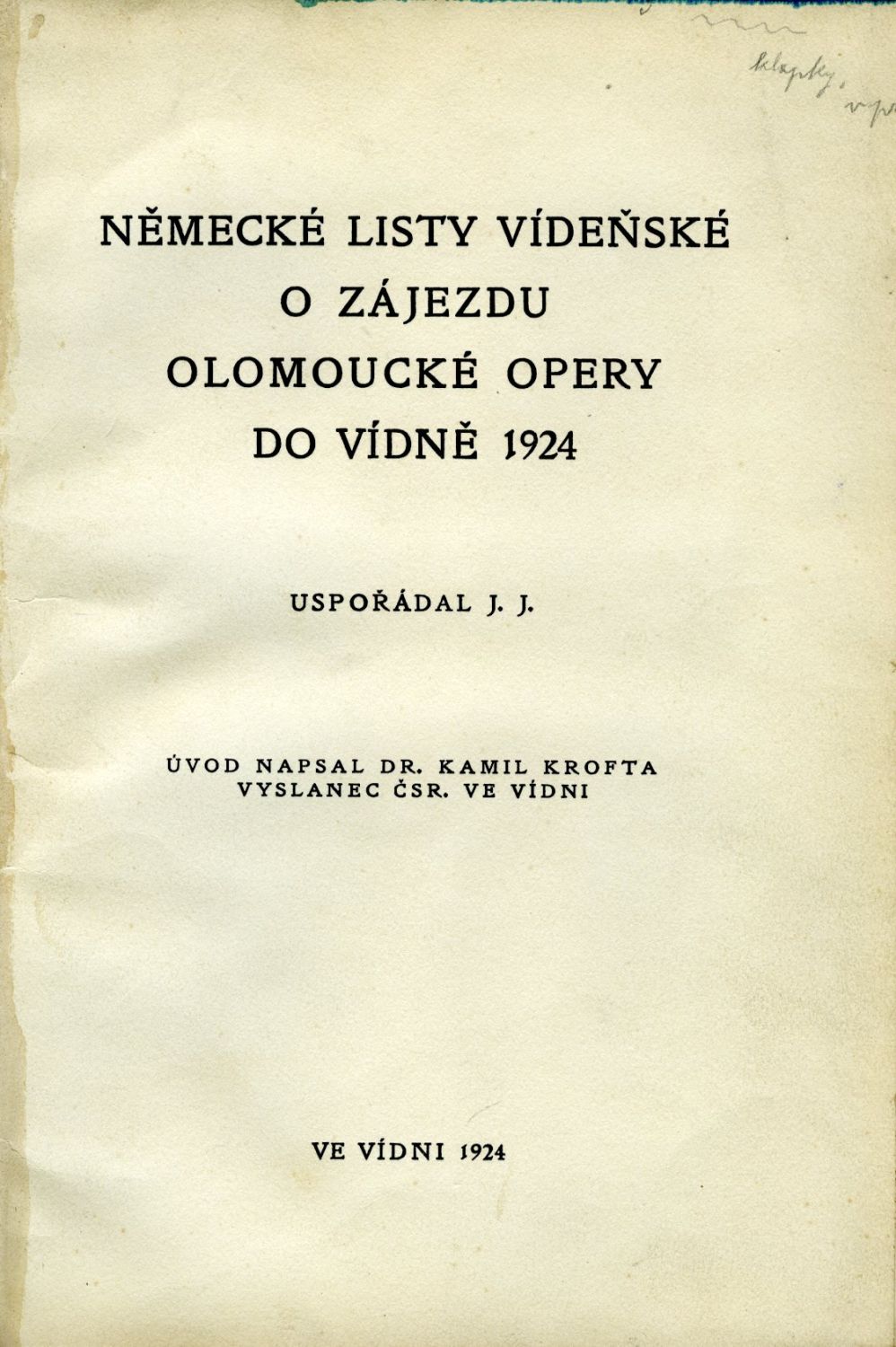 Německé listy vídeňské o zájezdu olomoucké opery do Vídně 1924. Uspořádal J. J. Úvod napsal dr. Kamil Krofta, vyslanec ČSR. ve Vídni.