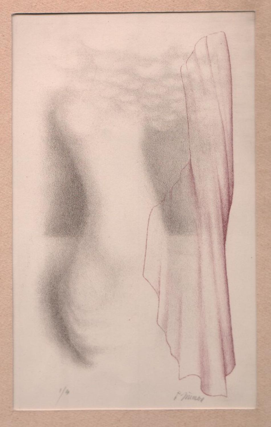 Dvoubarevná litografie o rozměru 165 x 90 mm (250 x 178 rozměr celého papíru), vpravo dole autorkou tužkou podepsaná, vlevo dole číslo tisku 1/4, které autorka ručně vytiskla. Strojový tisk litografie vyšel jako front. k Shakespearově sbírce Sonetů, vydaných v Praze Vilémem Šmidtem roku 1945 v jeho edici Malá veledíla.<br>Soupis grafického díla L. Jiřincové 210a.
