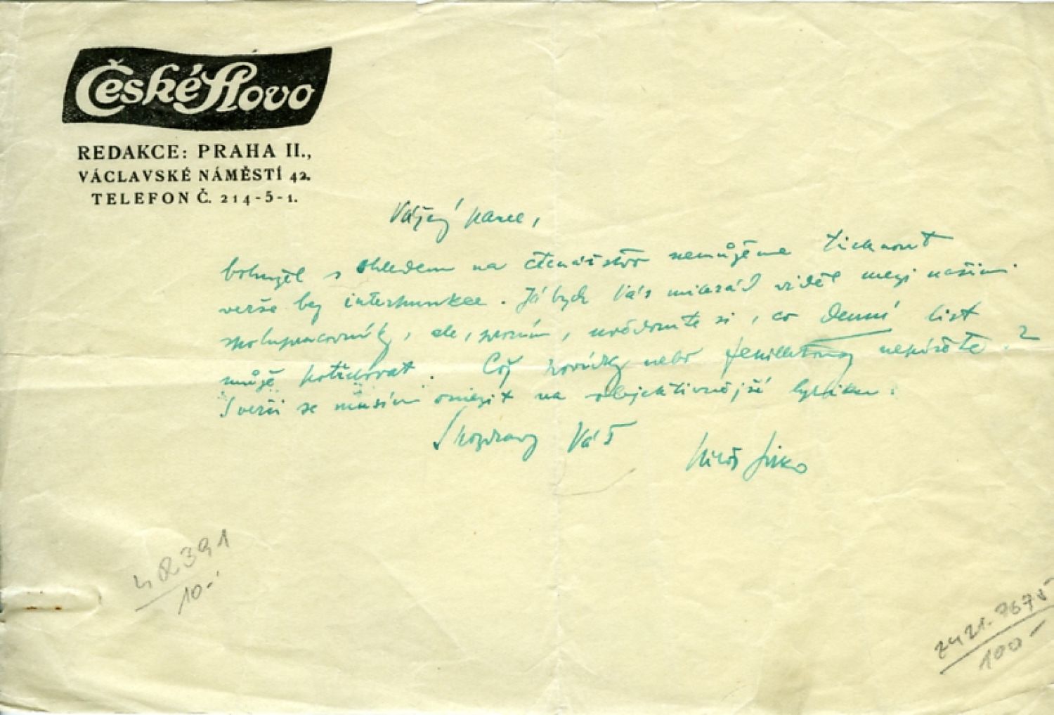 List 146 x 229 mm s tištěným záhlavím redakce Českého slova, popsaný po jedné str. zeleným inkoustem. Nedatovaný dopis se sdělením, že s ohledem na čtenáře nemohou tisknou verše bez interpunkce. Milerád by adresáta viděl mezi spolupracovníky, nepíše-li povídky nebo feuilletony, s verši se však musí omezit na objektivnější lyriku. - List dvakrát přeložený a pomačkaný.<br>