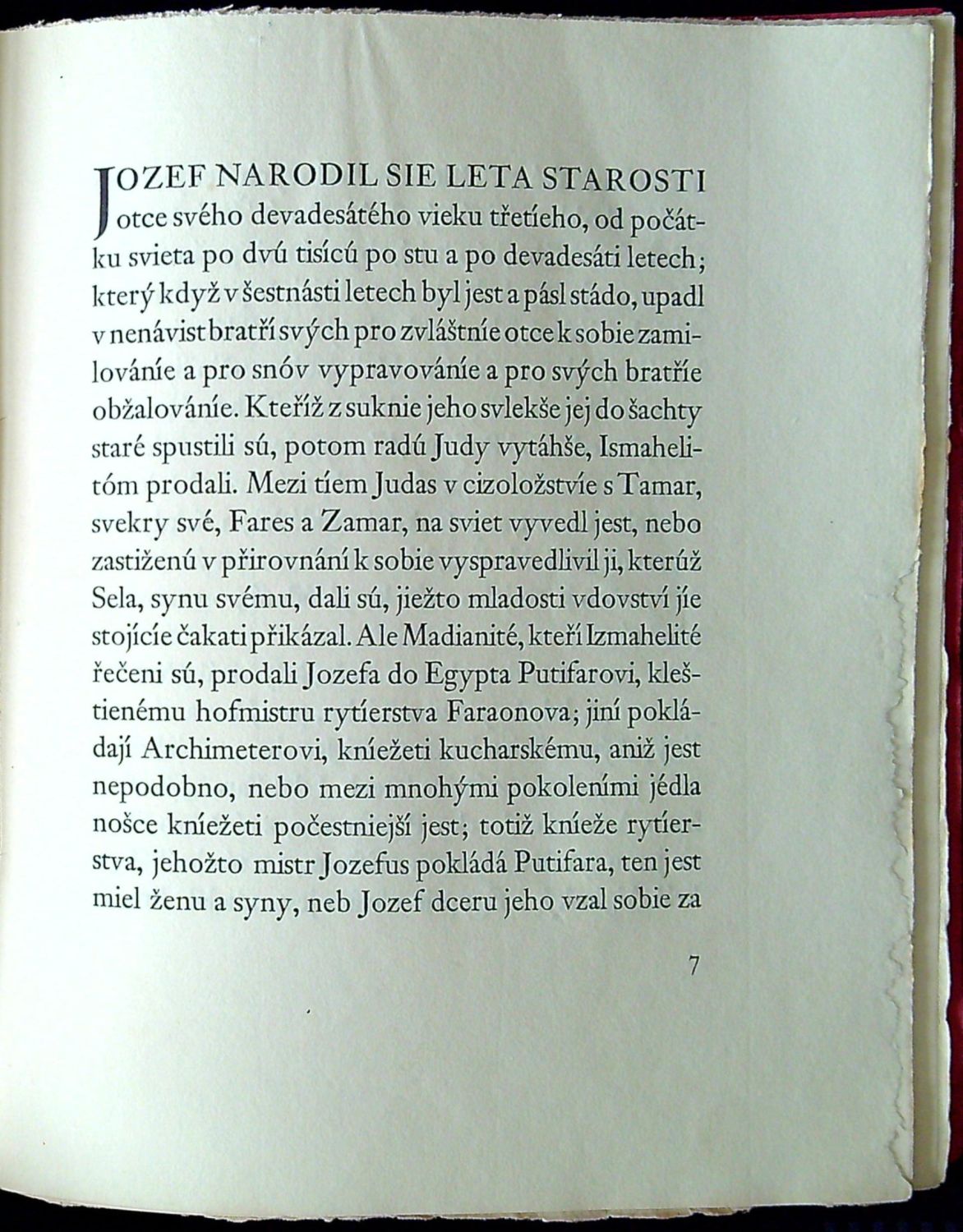 Ex. č. 11 z 15 výtisků vydání B tištěného na papíře Zanders, pěti ilustracemi, ručně kolorovanými, vyzdobil Albert Schamoni. Původní pap. obálka, kterou do dřeva vyřezal Albert Vyskočil, vytiskli Kryl a Scotti v Novém Jičíně. Schamoniho ilustrace pravděpodobně kolorovala Marie Florianová-Stritzková. V tiráži napsána jméno prvního vlastníka knihy - grafika Vrantiška Vika. <br>Obálka lehce zvlněná, při okrajích odřený papír, ve hřbetu pap. pokryv zčásti potrhaný a zčásti chybí, knižní neoříznutý.