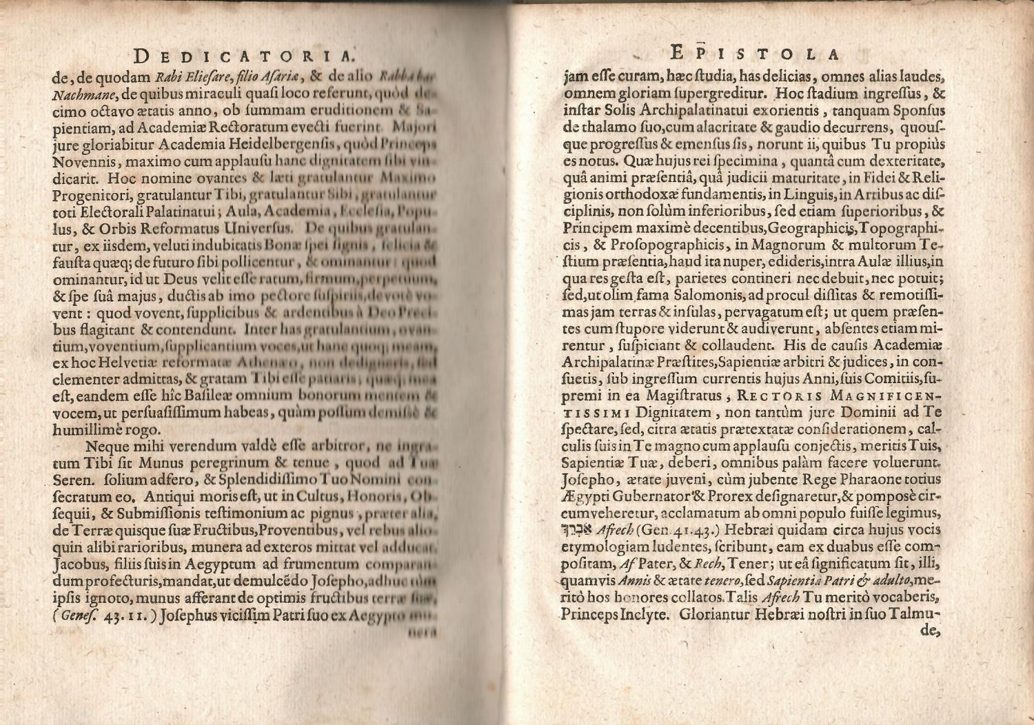 Hebrejsko-latinský tisk, místy ve dvou sloupcích, živá záhlaví, na posledních nečíslovaných stranách rejstřík. Konturové iniciály na ilustr. pozadí zalomené do výše 3-8 řádků, pásové vlysy, ozdobné lišty z ornamentů, na straně 95 v textu schematická ilustrace, koncová viněta.<br>Dobová pergamenová vazba, při horním okraji hřbetu inkoustem napsaný název, barvené ořízky. Papír místy zahnědlý, tu a tam drobné hnědé skvrnky způsobené kyselostí papíru.<br>Judah Halevi (cca 1075 Toledo či Tudela v Andalusii - 1141 Jeruzalém či Alexandrie v Egyptě) sefardský básník, lékař a filosof, jeden z největších hebrejských básníků světské i náboženské poesie. Nabízená práce je jeho nejznámějším filosofickým dílem. Práci napsal arabsky a konfrontuje v ní aristotelskou filosofii, křesťanství a islám a vykládá své názory na učení judaismu. Judah ibn Tibbon (Juda ben Saul ibn Tibbon) práci v polovině 12. století přeložil do hebrejštiny. Práce je rozdělena do pěti částí a má formu dialogu mezi rabínem a králem Chazarů, který rabbiho vyzval, aby ho poučil o zásadách judaismu ve srovnání s křesťanstvím a islámem. Práce měla velký vliv na následný vývoj judaismu, ovlivnila i hnutí haskaly, či židovské osvícenství. Knižně byla poprvé vytištěna hebrejsky roku 1506.<br>Johannes Buxtorf mladší (13.8. 1599 Basilej - 18.8. 1664 Basilej) profesor hebrejštiny na universitě v Basileji, syn významného hebraisty stejného jména. Připravil k novému vydání několik děl svého otce a dokončil a připravil k vydání díla, která otec nedokončil. Jeho překlad "Kuzari" je prvním (když nepočítáme hebrejský) a dodnes ceněným překladem pozoruhodné Haleviho práce. Napsal též řadu disertací o pracích Abravanela.