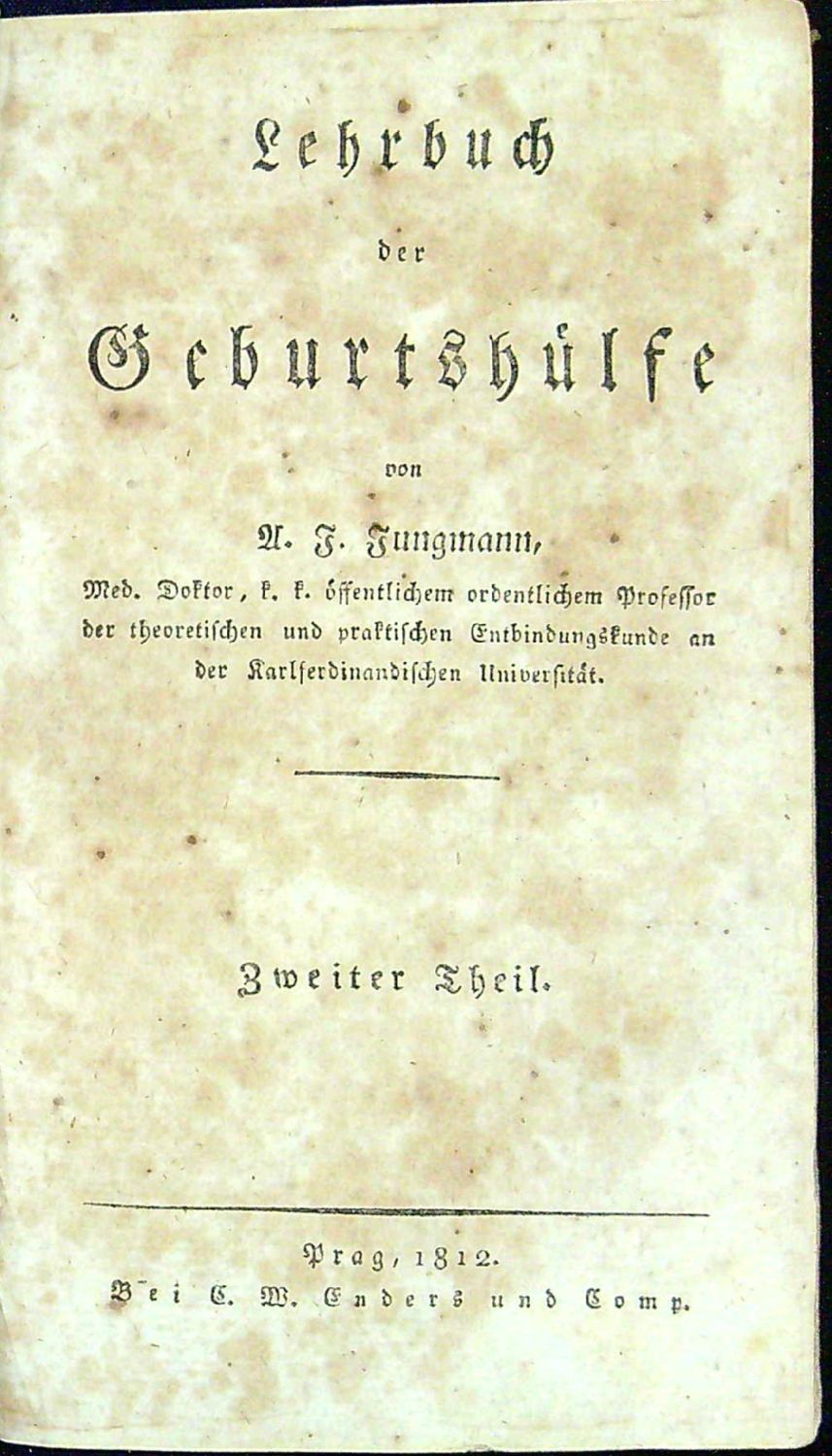 Hirsch III,470; SKC eviduje 2 ex., pouze však I. díl<br>Tištěno švabachem, latinská slova antikvou, mizící linky, paragrafy, ozdobné linky.<br>Dobová kartonová vazba s deskami potaženými škrobovým papírem, odřená, ve hřbetu potrhaná, při horním okraji chybí kus pap. pokryvu, papír místy zahnědlý, oslí uši.<br>Antonín Jan Jungmann (19.5. 1775 Hudlice u Berouna - 10.4. 1854 Praha) významný český lékař a obrozenec, universitní profesor gynekologie a porodnictví, roku 1839 rektor University Karlovy, zakladatel Pražské porodnické školy a autor prvé učebnice porodnictví a babictví v českém jazyce, která vyšla roku 1804.