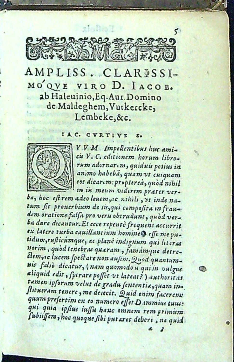 Na tit. listu viněta, konturové iniciály ve volném prostoru na ornamentálním pozadí zalomené do výše 4-5 řádků, tučně tištěné versálky ve výši 2 řádků, pásové tyče z ornamentů, živá záhlaví, tištěné poznámky po stranách. V kolofonu jméno tiskaře - Basilius Bouquet. Z řečtiny přeložil Jacob de Corte (Jacobus Curtius Brugensis).<br>Dobová vazba (125 x 90 mm) ze světlé vepřovice, na obou deskách tlačený rám, na přední desce uvnitř rámu plotna s vyobrazením znaku Brandenburska, nahoře v rámu iniciály objednatele vazby WVD, dole v rámu datace 1580, na zadní desce uvnitř rámu plotna s vyobrazením znaku města Wittenberga a latinským nápisem "Nil Validae Juvere Arces/ Aut Robora Belli Sed Meri/ To Pietas Populis Fortissi/ Ma Turris", nahoře i dole rám zdobený tlačenými rostlinnými ornamenty. Autorem vazby dle plotny (kolku) na zadní desce byl Nikolaus Müller z Wittenbergu (Konrad Haebler "Rollen und Plattenstempel des XVI. Jahrhunderts", Band I, str. 300, č. XVII). Ve hřbetu 3 vazy, ve druhém poli n perem psané staré evideční číslo, v ostatních polích tlačený ornament, na ořízkách tlačený ornament. Vazba ohmataná, na tit. listu starý vlastnický přípis, na líci posledního (čistého) listu rkp. poznámky perem, v textu místy rkp. marginálie. Od strany 1 po stranu 170 při vnějším okraji drobné dírky od červotoče. Ochranné kartonové pouzdro, potažené papírem imitujícím kůži s ornamentálním, přelakovaným potiskem z konce 19., či počátku 20. století.