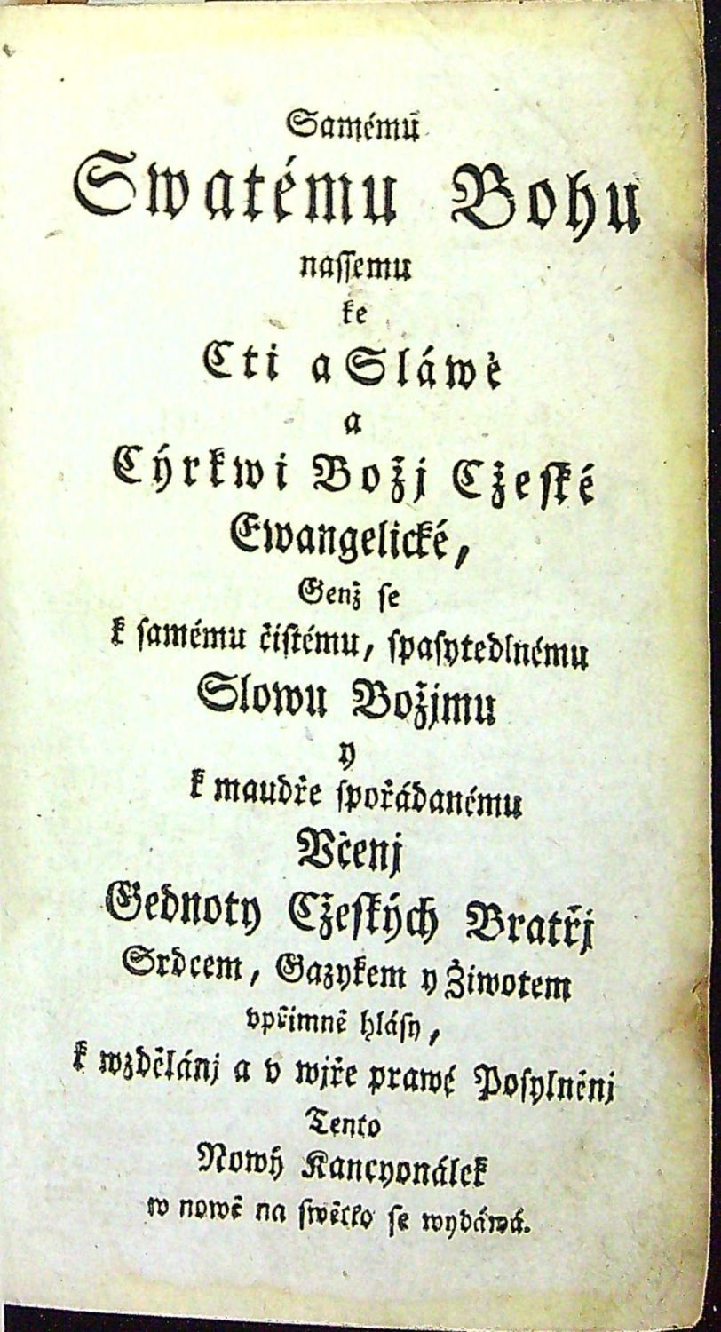 KANCYONAL To gest KNJHA Žalmů y Pjsnj Duchownjch, od rozličných Mužů Božjch Bratřj Cžeských y guných k Wzdělánj Probuzenj a Potěssenj Cyrkwe Krystowé w Báznj Božj složených, sebraných, a wadaných. Nynj pak pro Nedostatek potřebných Exemplářů we Gménu Páně w nowě zase wytisstěných, a Podlé Prawidla samého čistého y celého Slowa Božjho vpřímně spořádaných. Podle Berlinského Exempláře 1753.