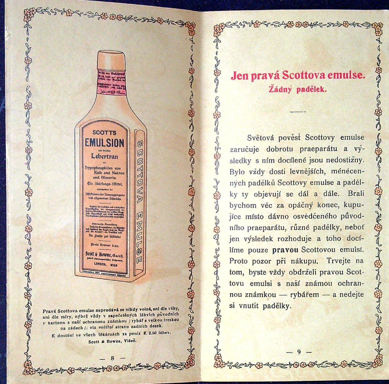 Červeno černě tištěný text olemovaný rámečkem z kvítků s lístečky, v textu tři vyobrazení lahvičky a balíčků emulse. 30 arabsky veršovaných strof s motivem emulse, na zbývajících listech reklama a popsané účinky emulse.