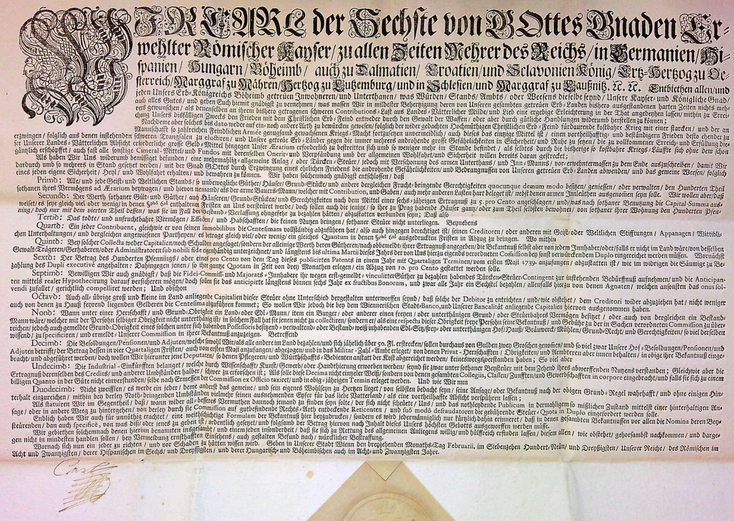 WIR CARL der Sechste von GOttes Gnaden Erwehlter Römischer Kayser/ zu allen Zeiten Mehrer des Reichs/ in Germanien/ Hispanien/ Hungarn/ Böheimb/ auch zu Dalmatien/ Croatien/ und Sclavonien König/ Ertz=Hertzog zu Oesterreich/ Marggraf zu Mähren/ Hertzog zu Lutzemburg/ und in Schlesien/ und Marggraf zu Lausznitz. etc. etc. Entbiethen allen/ und jeden Unsers Erd=Königreichs Böheimb getreuen Inwohneren/ und Unterthanen/ was Würden/ Stands/ Ambts/ oder Weesens dieselbe seynd/ .....