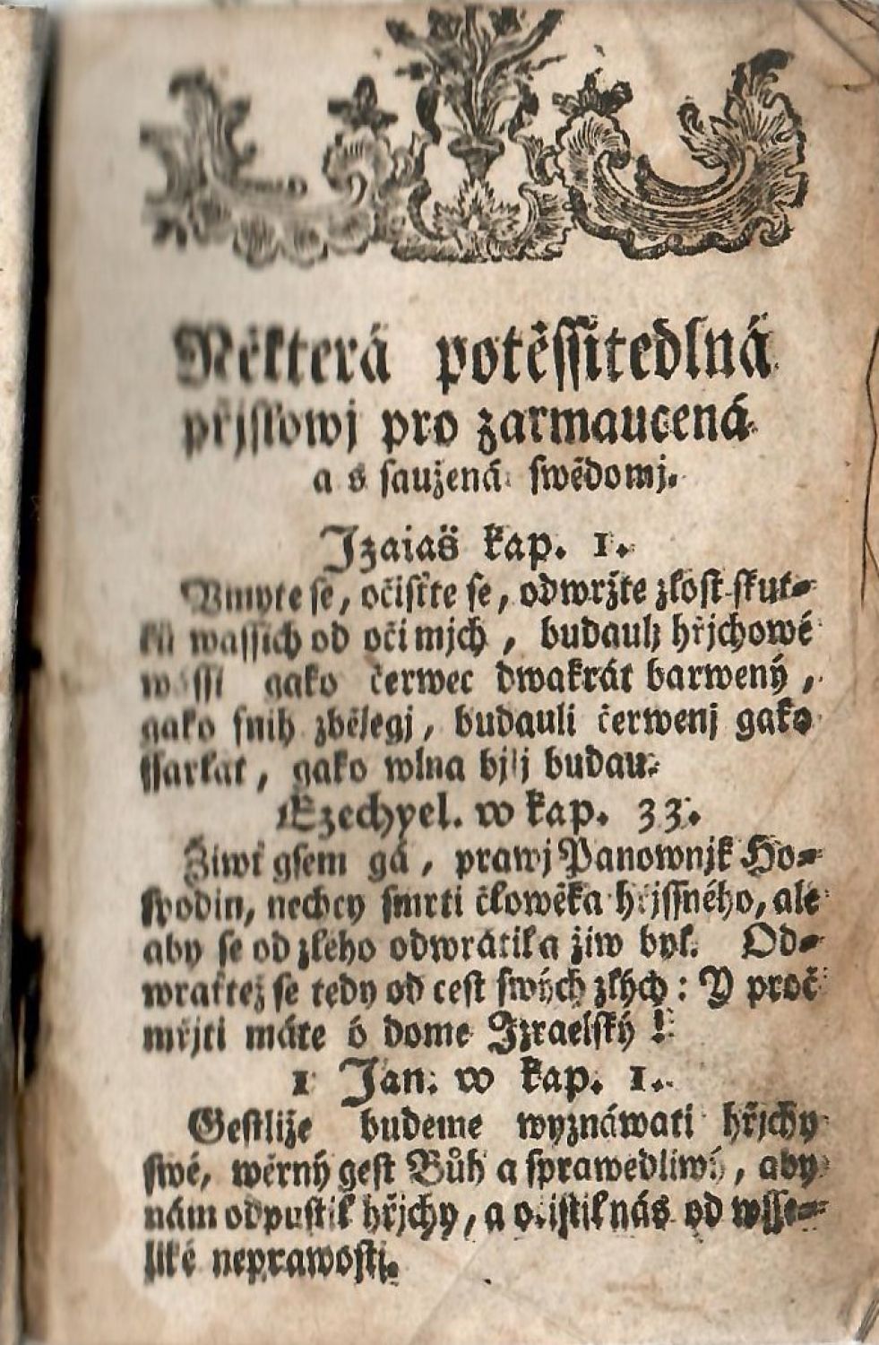 Knihopis 3907<br>12°, Tištěno švabachem, červeno-černě tištěný titulní list, živá záhlaví od sazby oddělená jednoduchou linkou, tučně tištěné iniciály ve výši 2 řádků, vstupní vlys, pásové lišty, vinětky, koncová viněta. Na foliu O-8a druhý titulní list samostaně paginované části "W.G.P. Pjsně a nebo Zpěwowé Ducownj, gichžto Wěrný a pobožný křesťan každého času gak při wyročnjch slawnostech a památkách; Tak y we wsselikých křesťanských potřebach, každodenně, ráno y v wečer před gidlem y po gidle, w křjžj y w zármutku vžjwati může. Žalm 95. Poďte, zpjwegme hospodinu; prokřikůgme na čest stale spasenj nassého". Jan Tomáš Höchenberger, 1783. Titulní list zasazený v rámečku z drobnéo ornamentu. Živá záhlaví od sazby oddělená jednoduchou linkou, tučně tištěné iniciálky ve výši 1-3 řádků, vstupní pásový vlys z ornamentů, koncová viněta. Knížku k vydání připravil Václav Matěj Kramerius.<br>Dobová kožená vazba s tlačeným jednoduchým rámem z drobného ornamentu, uvnitř rámu na obou deskách tlačená rostlinná a ornamentální kompozice se stylizovaným křížem uprostřed, ve hřbetu tři vazy, jednotlivá pole olemovaná ozdobnou linkou, uvnitř polí tlačená ozdůbka. Vazba lehce ohmataná, ve spodním poli hřbetu chybí kousek koženého pokryvu. Na několika listech škrtáno tužkou. Na přední předsádce vlastnický pap. štítek "Josef Šplíchal v Chotěšovicích u Chocně".