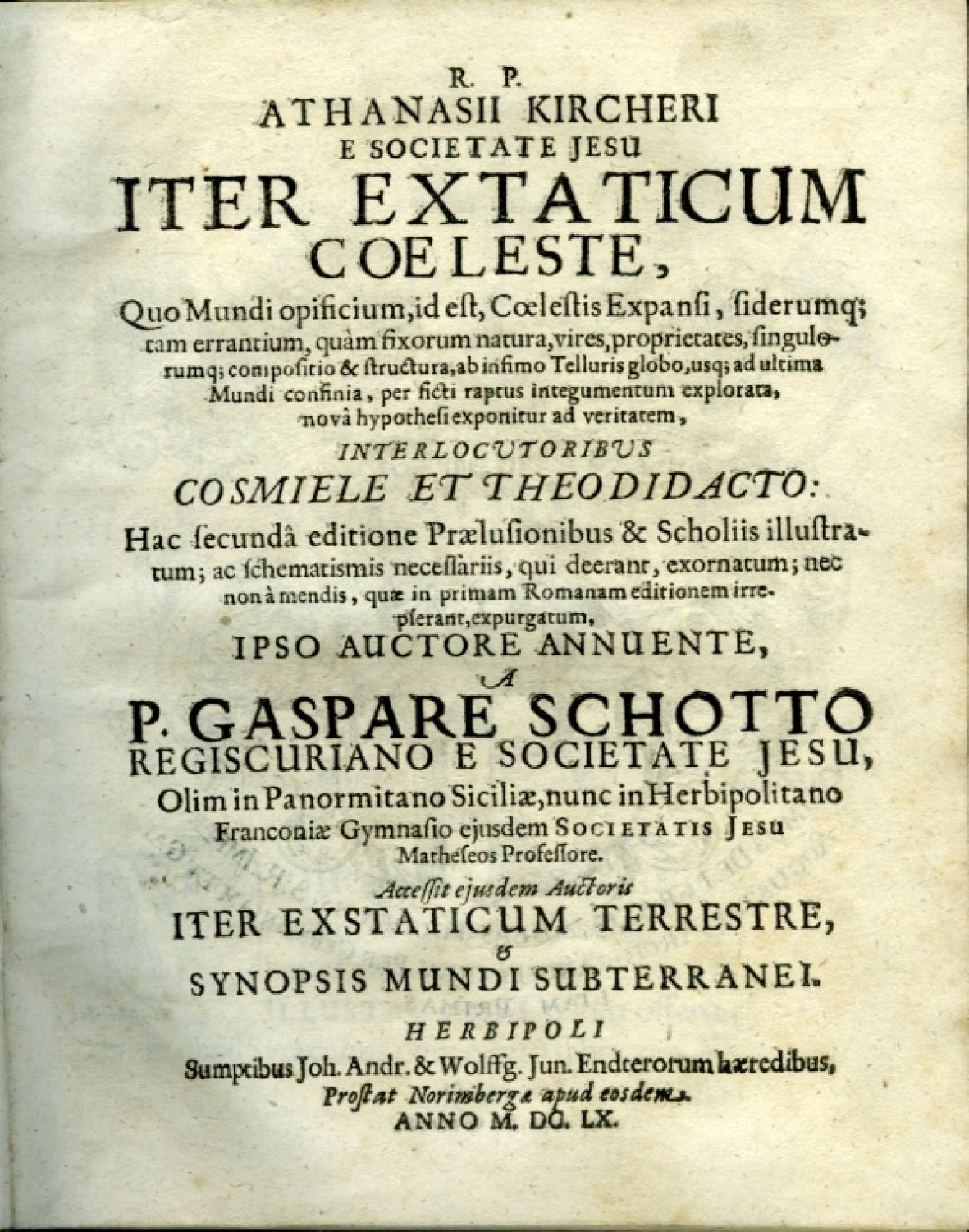 Iter extaticum Coeleste, Quo Mundi opificium, id est, Coelestis Expansi, siderumq[ue]; tam errantium, quam fixorum natura, ... Hac secunda editione Praelusionibus & Scholiis illustratum; ... ipso auctore annuente, a P. Gaspare Schotto ...