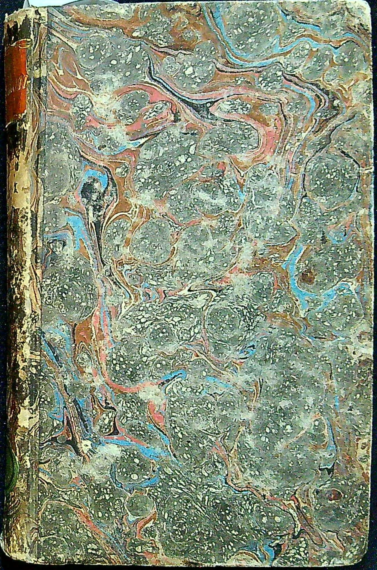 Dobová kartonová vazba potažená mramorovaným papírem, při horním okraji hřbetu červený kožený štítek s tlačeným a zlaceným názvem, při spodním okraji hřbetu oválný zelený pap. štítek s číslem, červeně barvené ořízky, vazba ve hřbetu místy odřená. Na tit. listu, jeho rubu a na několika stranách textu stará razítka neurčené, pravděpodobně zednářské lóže.