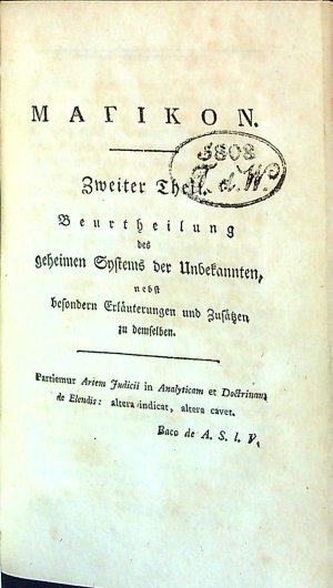 MAGIKON oder das geheime System einer Gesellschaft unbekannter Philosophen (= Louis Claude de Saint-Martin) unter einzelne Artikel geordnet, durch Anmerkungen und Zusätze erläutert und beurtheilt, und dessen Verwandtschaft mit ältern und neueren Mysteriologien gezaigt. In zwei Theilen. Von einem Unbekannten des Quadratscheins, der weder Zeichendeuter noch Epopt ist = J. F. Kleuker)
