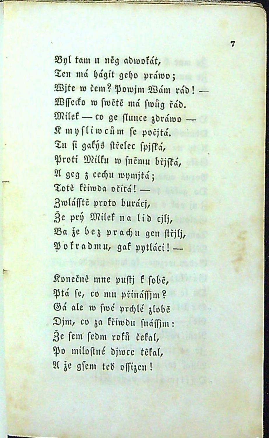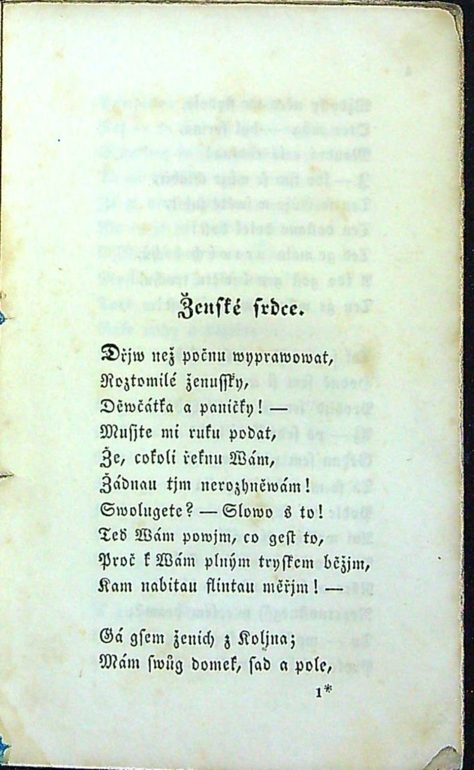 Tištěno švabachem. - Původní pap. obálka, papírový pokryv ve hřbetu ve spodní polovině chybí a v horní polovině je natržený.