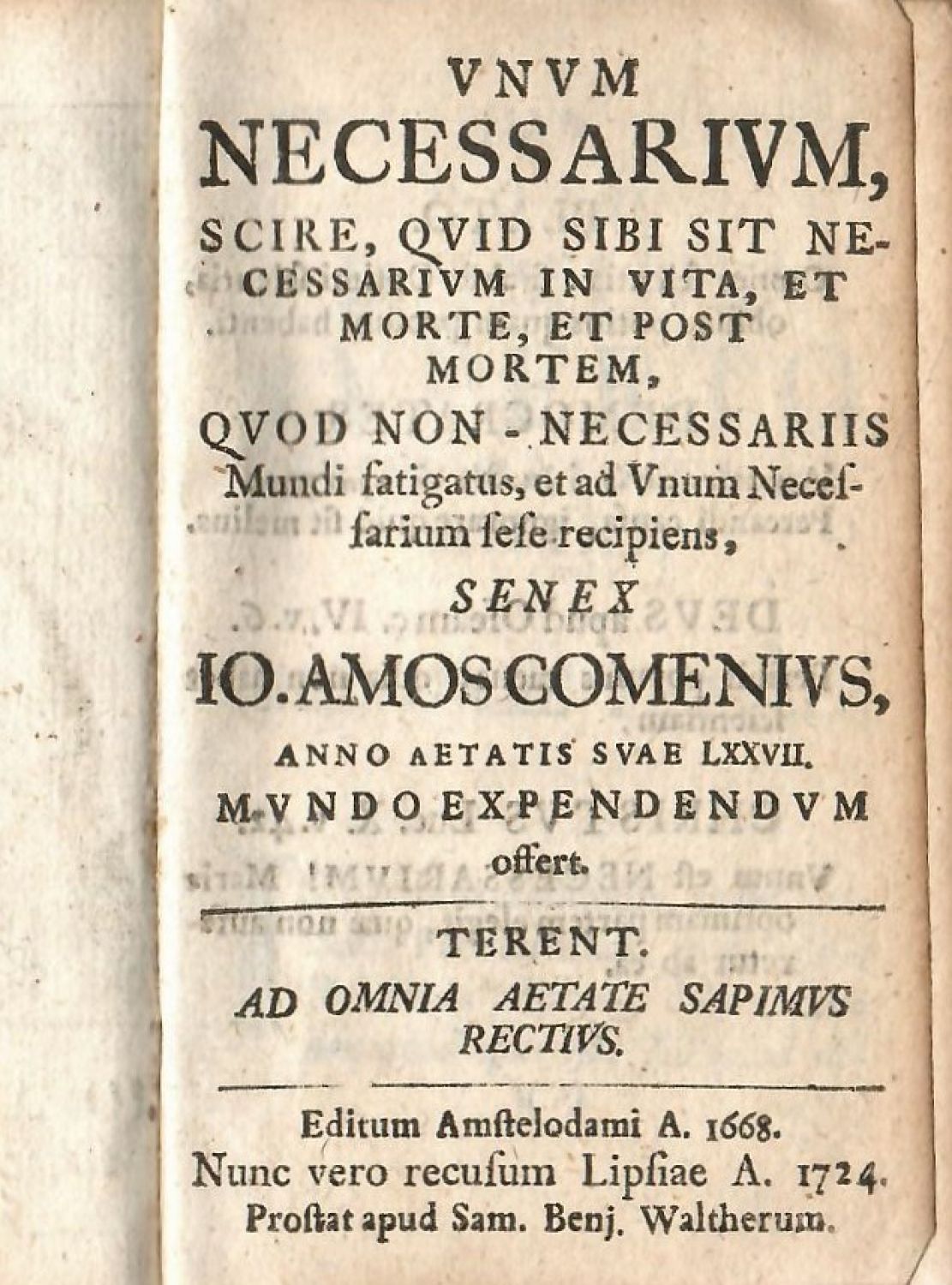 VNVM NECESSARIVM, SCIRE, QVID SIBI SIT NECESSARIVM IN VITA, ET MORTE, ET POST MORTEM. QVOD NON - NECESSARIIS Mundi fatigatus, et ad Vnum Necessarium sese recipiens, SENEX IO. AMOS COMENIVS, ANNO AETATIS SVAE LXXVII. MVNDO EXPENDENDVM offers. TERENT AD OMNIA AETATE SAPIMVS RECTIVS. Editum Amstelodami A. 1668. Nunc vero recusum Lipsae.