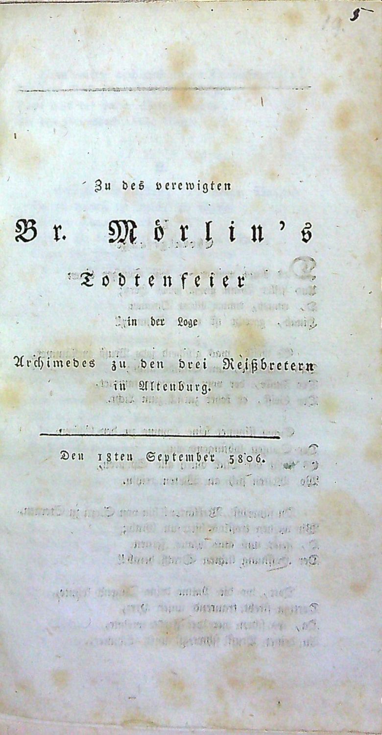 5. "Zu des verewigten Br. Mörlin´s Todtenfeier in der Loge Archimedes zu den drei Reissbretern in Altenburg", [Altenburg], 18.9. 5806 (= 1806), 2 listy.