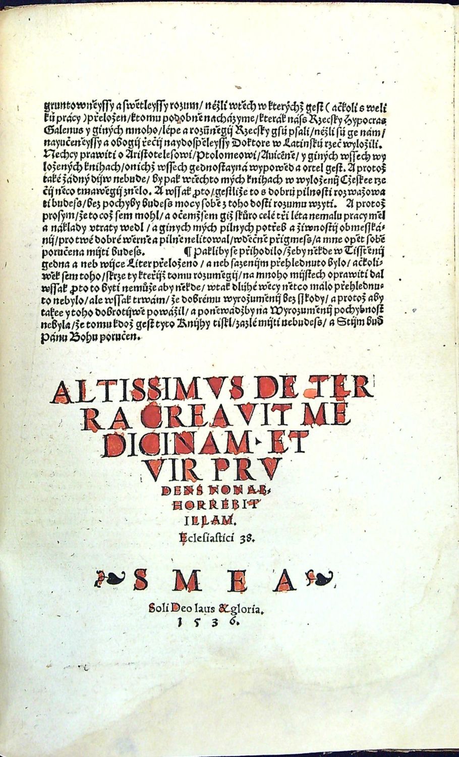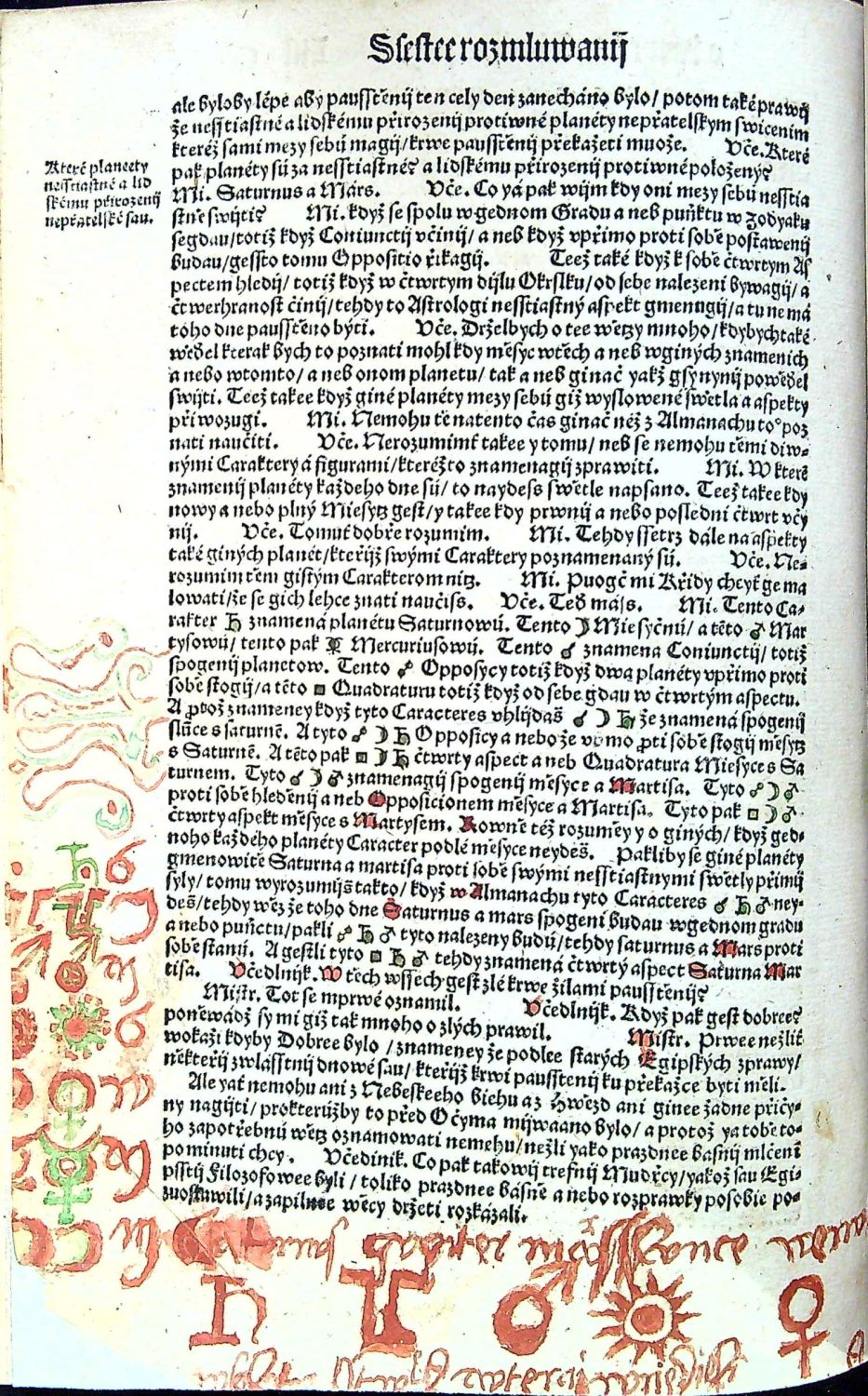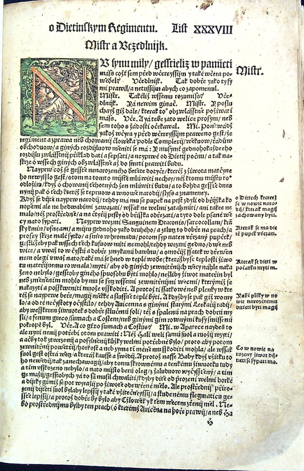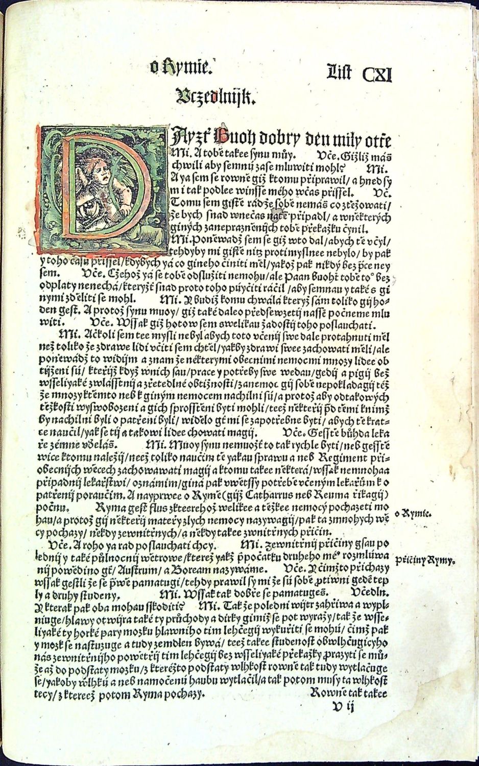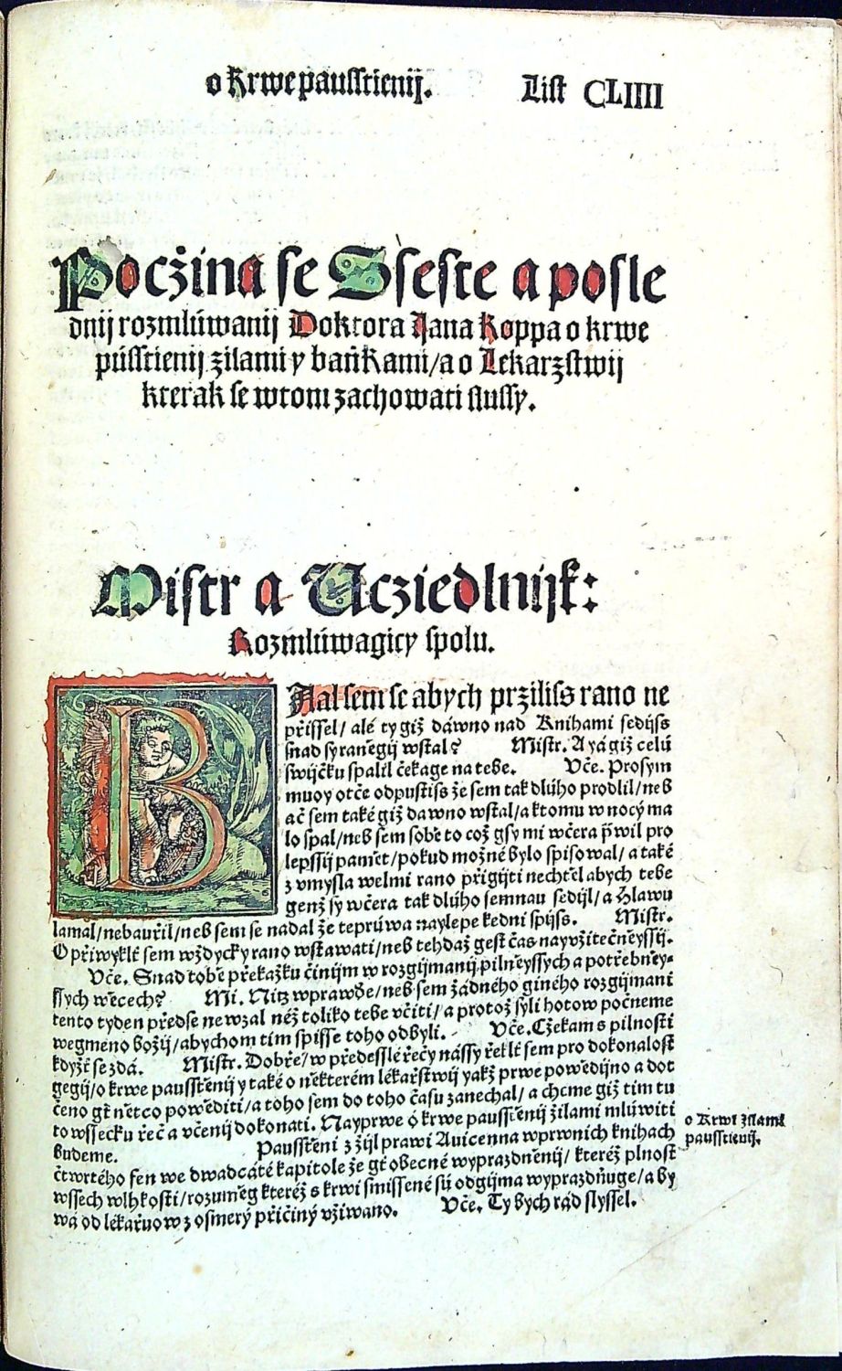 Knihopis 4315<br>Tištěno gotikou, latinská slova antikvou, živá záhlaví, latinská paginace listů při horním vnějším okraji, tištěné poznámky po stranách, rubriky nestejné velikosti. Kniha obsahuje šest rozmlouvání, v úvodu každého rozmlouvání kolorovaná iniciála a též kolorovaný nadpis rozmlouvání.<br>Kartonová vazba potažená rukopisem na pergamenu z první půle 15. století, na obou deskách dvě vázací tkanice, stříkaná svrchní ořízka. Chybí první čtyři listy, folia A4 a A5 při horním okraji dolité v šíři 7 a 5 cm a chybící text kaligraficky hnědým perem dopsaný, též chybí poslední list (konec rejstříku a na jeho rubu tištěný kolofon) - Rejstřík kaligraficky hnědým perem dopsaný. Kniha byla odborně restaurována, papír odkyselen a chybící kousky papíru při spodním i horním okraji dolité (bez zásahu do textu). Na foliu LXX utržen pravý spodní okraj papíru, na několika listech drobné dírky. Místy dobové rkp. marginálie se vztahem k textu. Na foliu CLVIIr a části folia CLVIIIv červeno-zeleně malovaná různá znamení a nečitelný nápis v českém jazyce (....saudu ? pane zapsal ...?) se vztahem k textu (některá písmena na dvoustraně rubrikována, na foliu CLXVIv zeleně malovaná nebeská znamení. Nové ochranné kartonové pouzdro a ochranná krabice. <br> Jan Kopp z Raumenthalu (cca 1487 u Landsbergu am Lech - 1562 či 1563 pravděpodobně ve Stockholmu) německý lékař, spisovatel a astronom, osobní lékař Ferdinanda I. Habsburského a poté švédského krále Gustava I. Vasy. Studoval nejprve ve Freiburgu am Breisgau a studia dokončil na universitě ve Vídni. Or roku 1515 žil krátce v Jáchymově a poté v Mostě, kde se oženil a založil rodinu. Po jistých peripetiích byl roku 1528 povolán do Prahy ke dvoru jako královský lékař. Nabízená kniha je jeho stěžejním dílem, do češtiny ji přeložil Hynek Krabice z Veitmile.