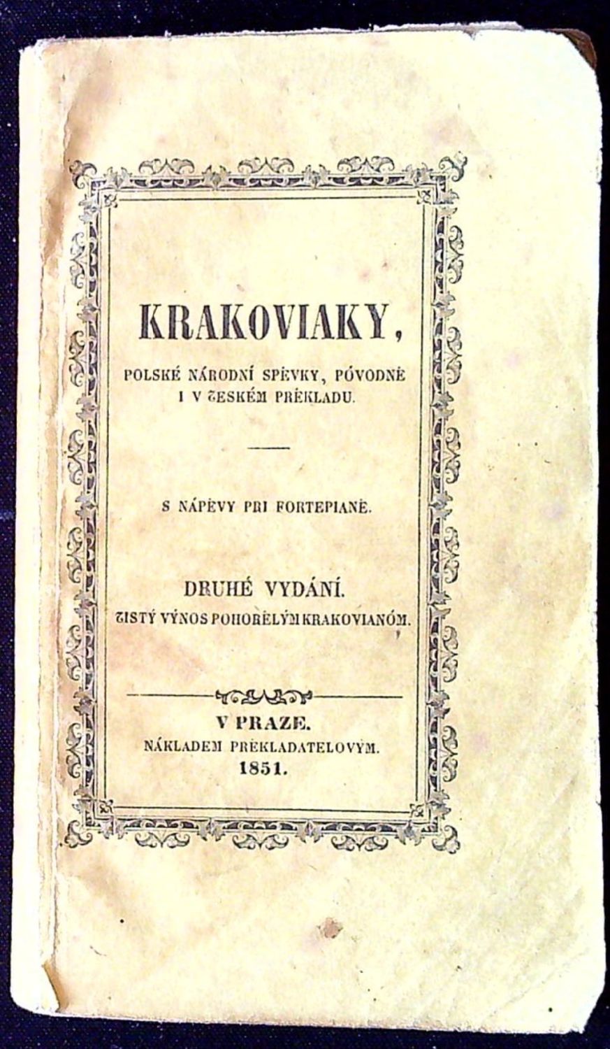 Doucha 110<br>Tištěno antikvou, na sudých stranách původní polský text, na lichých Hankův převod do češtiny. V úvodu Hankova poznámka o polské výslovnosti. Za textem tři rozkládací arabsky číslované přílohy s notací a nápěvy v češtině i polštině. Na tit. listu mezi kompozicí z vlnovek Hankovy iniciály. - Původní pap. obálka, na přední straně klasicistní rám zdobený rostlinným ornamentem, na straně zadní stejný rám s vinětou puttiho uprostřed, při spodním okraji údaj o tiskaři (C.k. knihtiskárna Synóv Bohumila Haase). Při okrajích obálky oslí uši, v textu tu a tam drobné hnědé svrnky způsobené kyselostí papíru.