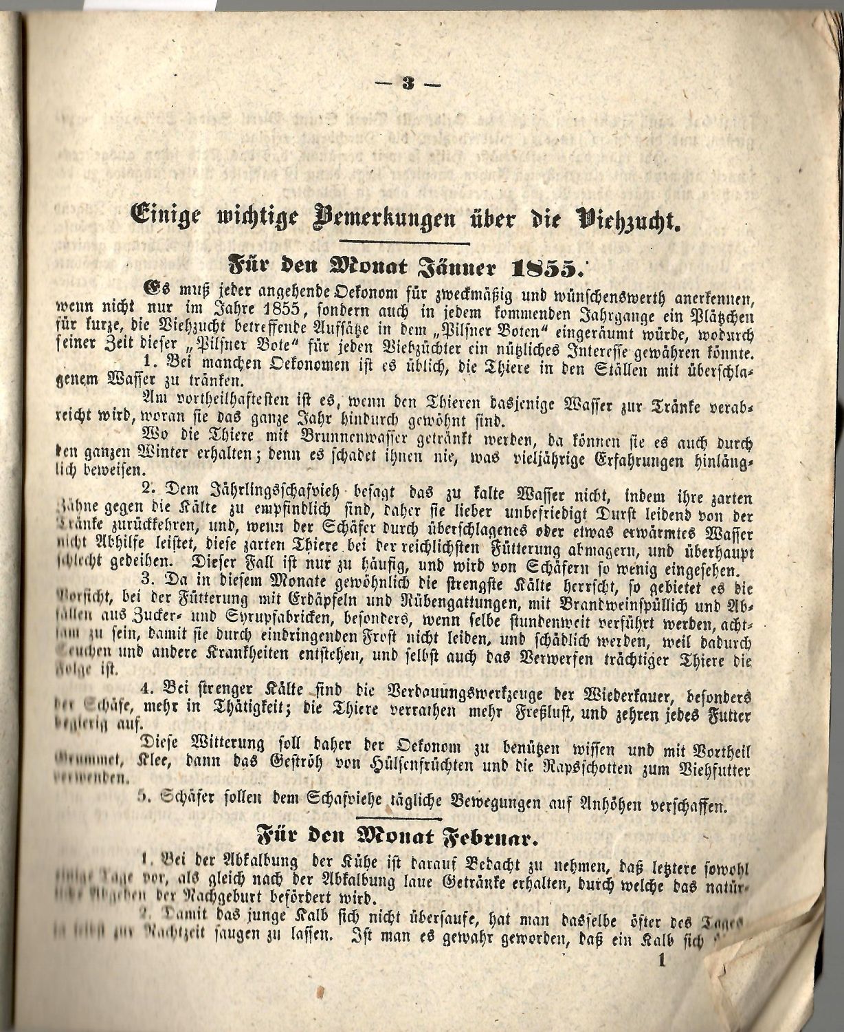 Tištěno gotikou, arabská paginace stran uprostřed horního okraje mezi krátkými pomlčkami, tučně tištěné nadpisy rad pro jednotlivé měsíce. <br>Dobová obálka z modrého papíru, papír na obálce místy pomačkaný, v textu zahnědlý, oslí uši (při spodním okraji výraznější.<br>Brožura obsahuje rady jak se starat o dobytek v jednotlivých měsících roku z pera Johanna Kreitla, zvěrolékaře působícího u hraběte Schönborna a plzeňského měšťana.
