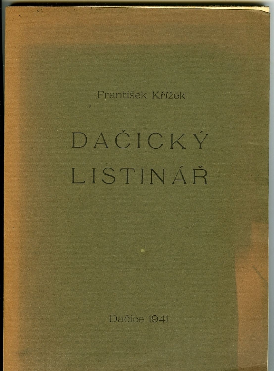 Obálka při okrajích vyšisovaný, při vnějších rozích několik listů mírně pomačkaných, knižní blok nerozřezaný.<br>Kniha obsahuje výběr 73 listin a jiných pramenných záznamů, týkajících se města Dačic, od nejstarší zprávy z roku 1184 až do sklonku 18. století. Část publikovaných listin byla otištěna již jinde, ale většina pochází ze zdrojů do té doby dosud nepoužitých, z městského archivu dačického, z archivu ministerstva vnitra a ze zemského archivu v Brně. Autor byl archivářem města Dačice.