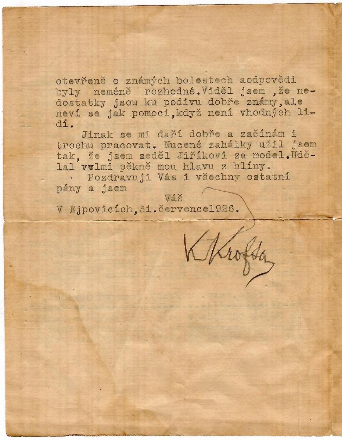 Dvoulist 17 x 13 cm dvakrát přeložený, v horizontálním ohybu natržený, pomačkaný a s mapami po vlhkosti. - Pisatel oznamuje, že píše levou rukou, zřejmě po úrazu ruky pravé; děkuje za výstřižky a za přání k padesátinám, Beneš mu přál dlouhým listem a zval jej do Ploškovice; nucené zahálky užil Krofta tak, že seděl Jiříkovi za model. Datováno v Ejpovicích 31.7.1926. - Kamil Krofta (1876 Plzeň – 1945 Vráž), historik Gollovy školy, univerzitní profesor, čsl. politik a diplomat.
