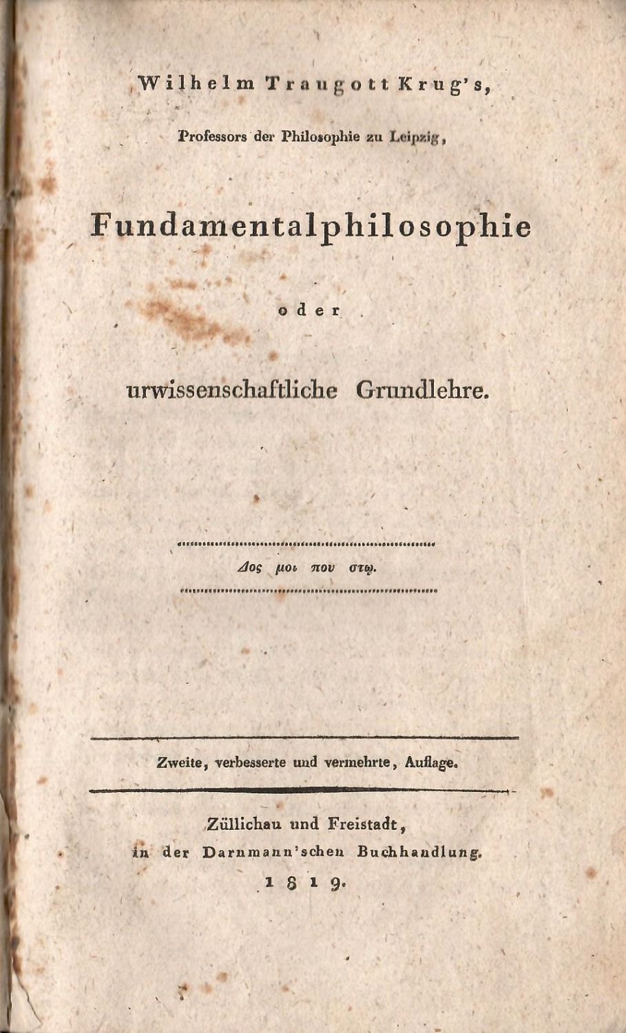 Tištěno antikvou, živá záhlaví, paragrafy, tištěné poznámky pod čarou. V úvodu dvě předmluvy autorovi, prvá převzatá z prvního vydání z roku 1803, druhá autorem napsaná k tomuto 2. opravenému a rozšířenému vydání, datovaná v Lipsku 9.3. 1819.<br>Dobová kartonová vazba potažená dobovým papírem, ve hřbetu pap. pokryv potrhaný, barvené ořízky. Vazba ohmataná a zašpiněná, naražené rohy, papír zahnědlý, tu a tam drobné hnědé skvrnky.<br>Wilhelm Traugott Krug (22.6. 1770 Radis - 12.1. 1842 Lipsko), filosof, od roku 1805 působil jako nástupce I. Kanta na uviversitě v Královci a od roku 1809 v Lipsku. Člen zednářské lóže "Minerva" v Lipsku a roku 1833/34 liberální poslanec 1. komory prvního ústavního saského zemského sněmu, mimo jiné předložil sněmu petici za emancipaci Židů v Saském království. Nabízená práce je jeho nejdůležitější knihou, popisuje v ní svůj filosofický systém, první vydání vyšlo roku 1803.