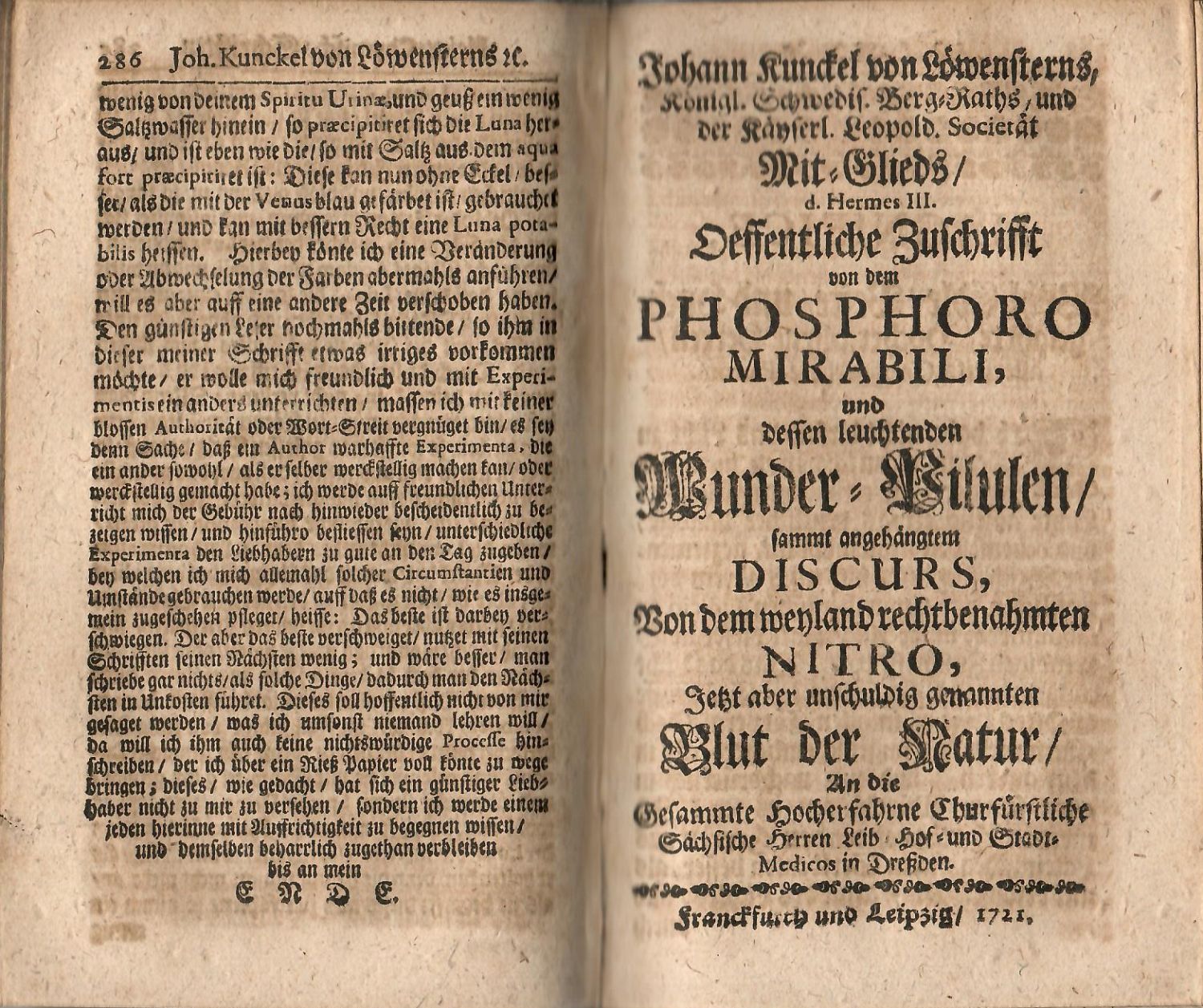 Duveen str. 329; Fergusson I,483; Ferchl str.<br> Tištěno švabachem, latinský text antikvou, neživá záhlaví od sazby oddělená jednoduchou linkou. Iniciálky propletené úponky zalomené do výše 3-7 řádků, tučně tištěné versálky ve výši 2 řádků. Pásové vlysy, viněty, ozdobné tyče, drobné tiskařské ozdůbky. Hlavní titulní list přes dvě strany, šest vedlejších tit. listů. - Autorem prvních pěti traktátů je J. Kunckel, autorem šestého Ch. Brummet a předmluvu napsal J. P. Burggrav.<br>Dobová pergamenová vazba, barvené ořízky. Přes horní okraj hřbetu přelepen starý pap. štítek s ručně psaným názvem, pod ním perem psané knih. číslo, na zadní desce při vnějším horním okraji částečně nalomený roh vazby, vazba mírně pokroucená a lehce zašpiněná. Na titulním listu staré razítko neurčené zednářské lóže.<br> Johannes Kunckel von Löwenstern (cca 1630 Wittenberg - 20. 3. 1703), významný německý alchymista a sklář. Švédským králem Karlem XI. povýšený do šlechtického stavu.