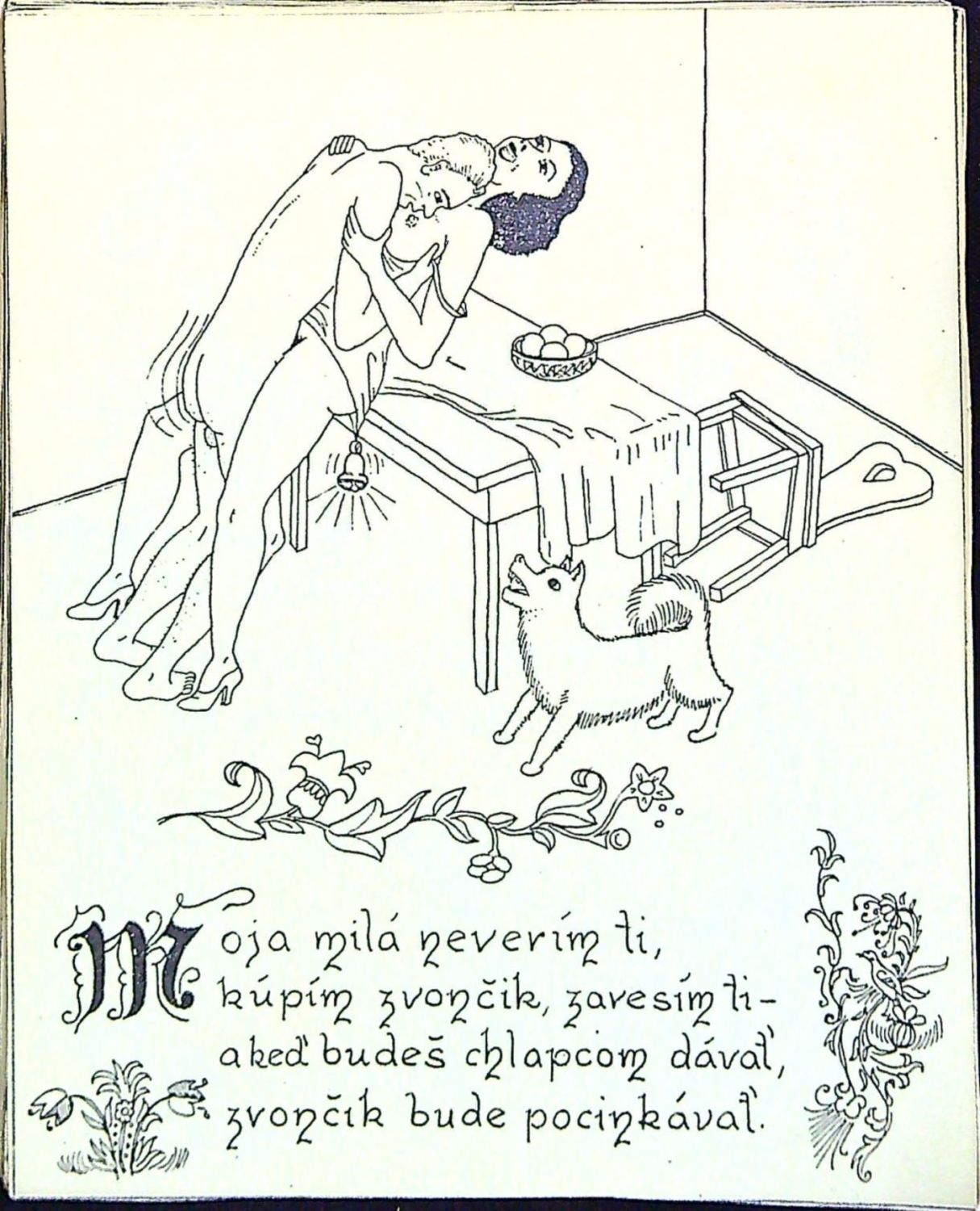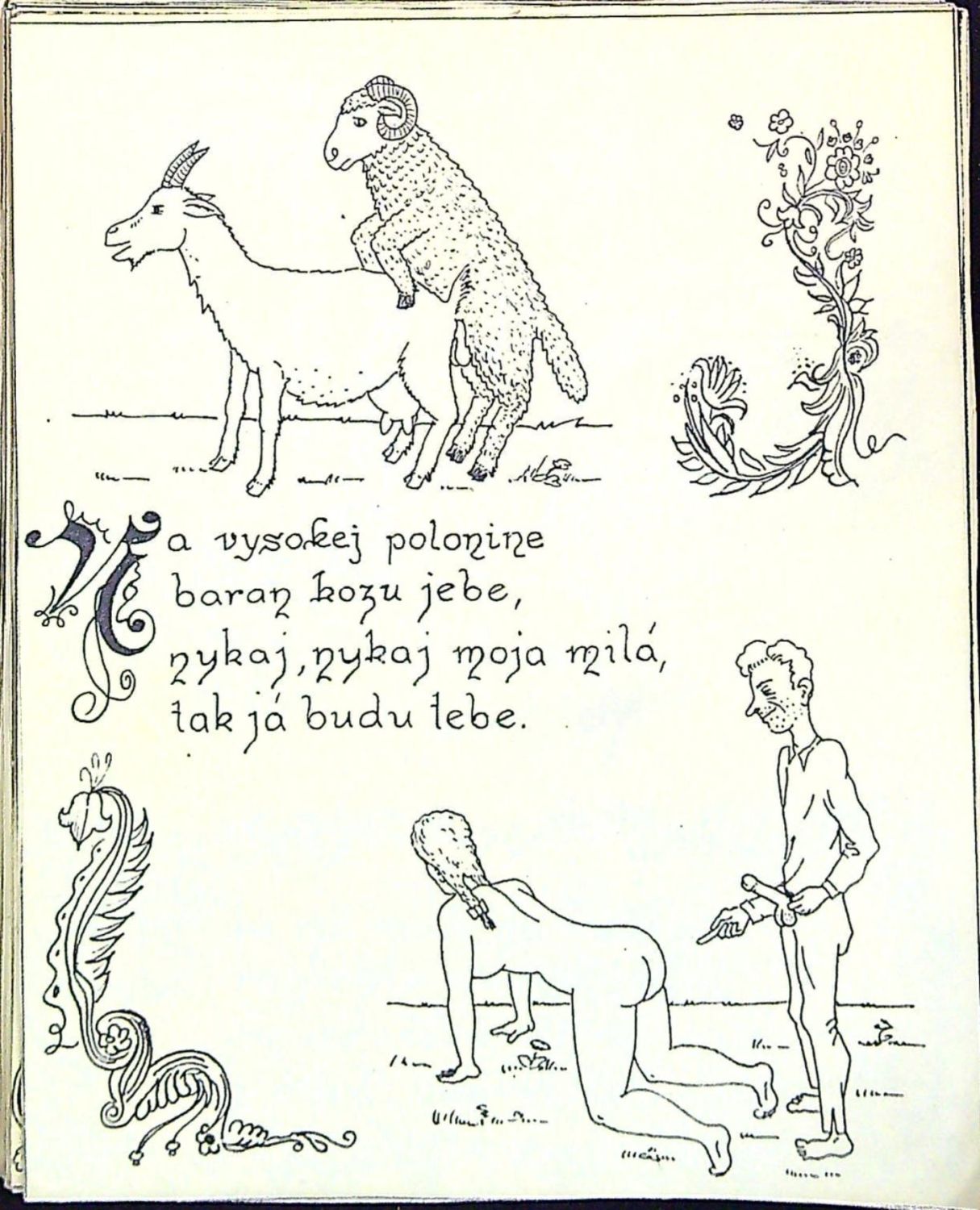 Hýsek, dodatky č. 587.<br>. Původní papírová obálka, ve které je volně vloženo 18 listů s reprodukcemi pornografických kreseb s kaligraficky psanými doprovodnými verši psanými částečně ve slovenštině, částečně v češtině (tisk pouze po lícové straně listů). Na přední straně obálky kresba s názvem, na zadní tiráž: sebral: Ňákej Sprosťák, název díla: Kytice sproston. písní. Sborník lidové posie, kresby: 2 ak. mal. zvučných jmen, obálka: jednoho z nich, vydal: Bří. Teplí, roku: 1945, v edici: "Čistému vše čisté", vytiskl: "Pornotisk", vydání prvé. Obálka mírně pomačkaná a v jednom místě lehce natržená.