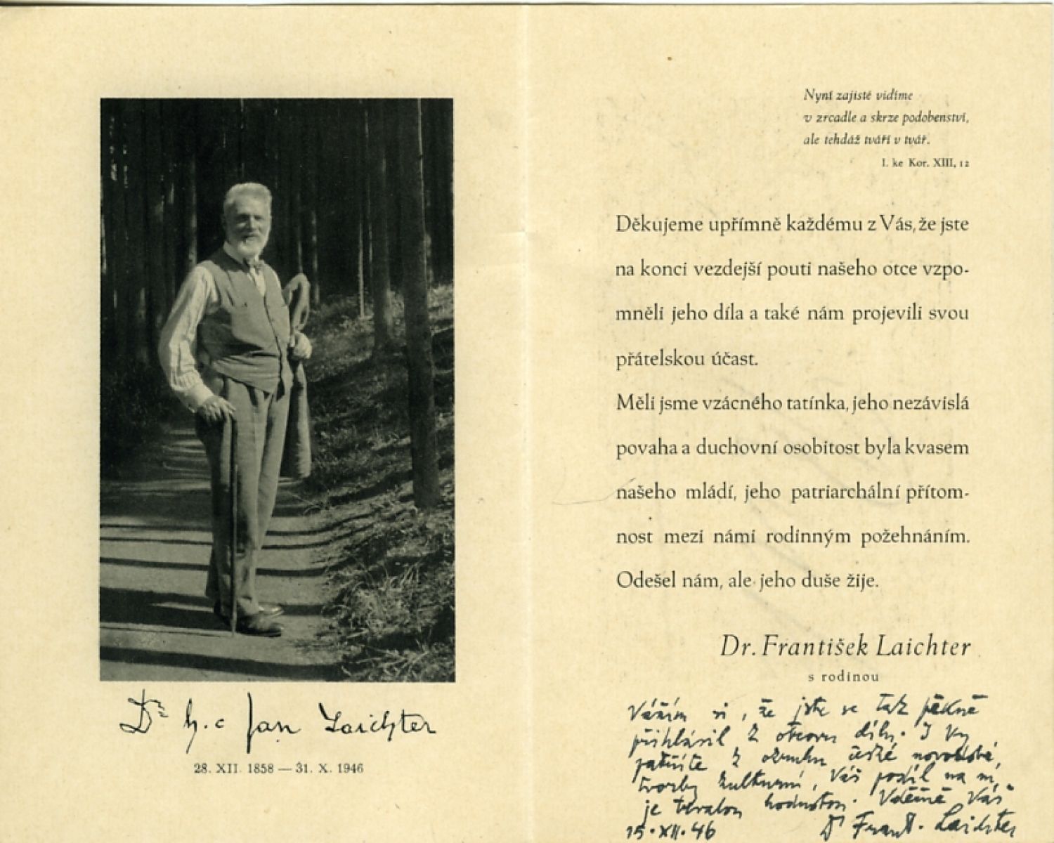 9) Tištěné poděkování Dr. Františka Laichtera za projev účasti nad otcovým úmrtím s jeho přípisem. Dvoulist tužšího papíru 172 x 108 mm, na rubu prvního listu reprodukce fotografie Jana Laichtera a jeho podpisu, na líci druhého tištěné poděkování a přípis modrým inkoustem neurčenému adresátu: "Vážím si, že jste se tak pěkně přihlásil k otcovu dílu. I Vy patříte k okruhu české novodobé tvorby kulturní, Váš podíl na ní je trvalou hodnotou. Vděčně Váš Dr. Frant. Laichter. 15.XII.46".<br>