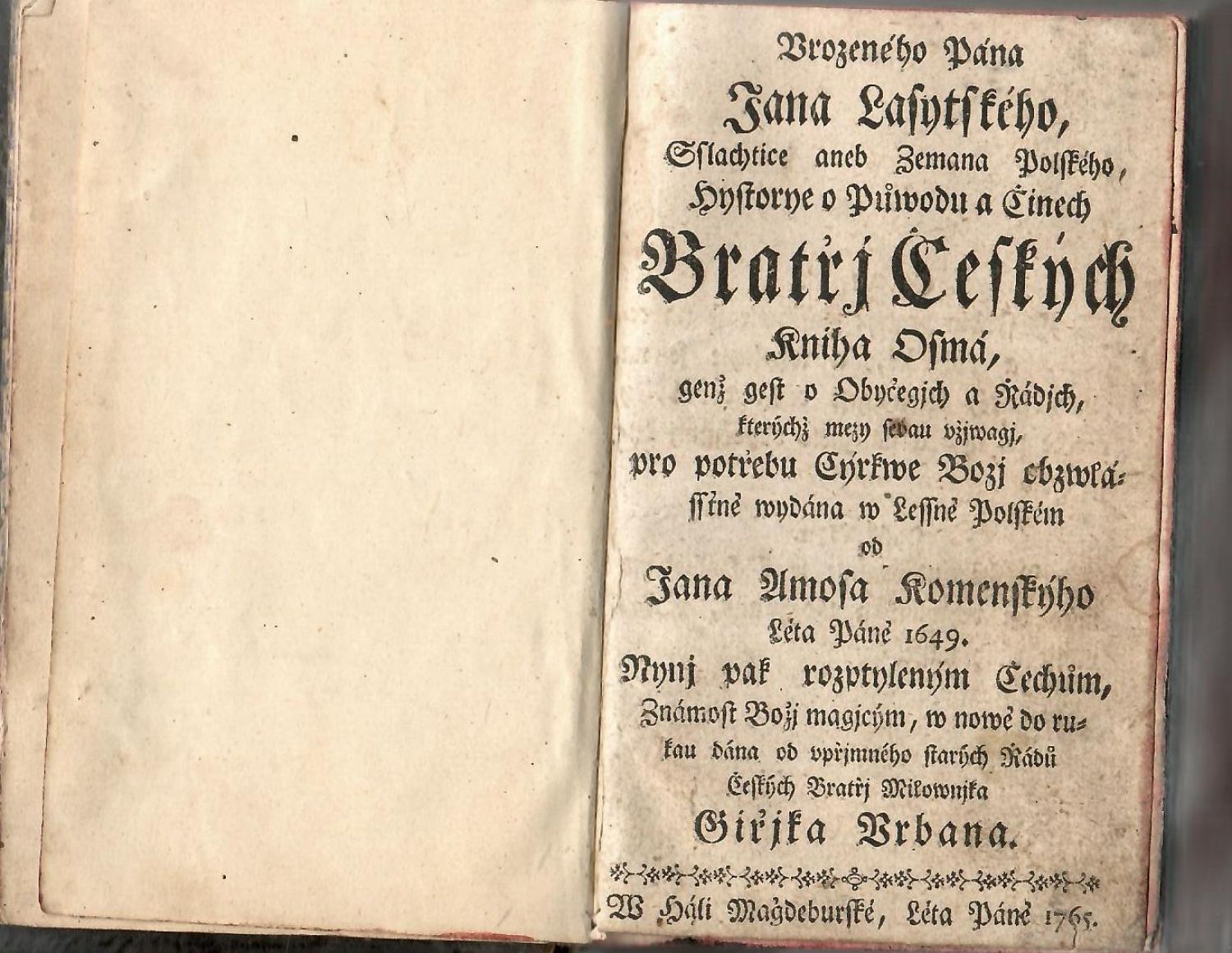 Vrozeného Pána Jana Lasytského, Sslachtice aneb Zemana Polského, Hystorye o Půwodu a Činech Bratřj Ceských Kniha Osmá, genž gest o Obyčegjch a Řádjch, kterýchž mezy vžjwagj, pro potřebu Cýrkwe Bozj obzwlássťně wydána w Lessně Polském od Jana Amosa Komenskýho Léta Páně 1649. Nyni pak rozptyleným echům, Známost Božj magjcým, w nowě do rukau dána od upřjmného starých Řádů Českých Bratřj Milownjka Giřjka Urbana.
