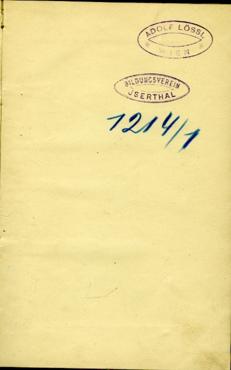 Nárožnice a hřbet potaženy vínovým plátnem, na hřbetě zlac. věcný název a starý knihovnický štítek; na přední předsádce, 1. titulním a následujícím listu stará razítka "Bildungsverein Iserthal" a rkp. knih. signatury, impresum zde část. vymazáno a začerněno, na prvních dvou listech přívazku hnědé skvrnky, tit. a poslední strana zde mírně ušpiněná.<br>
