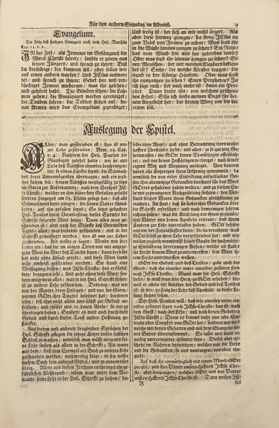 Das Christliche Jahr, oder die Episteln und Evangelien, Auf die Sonn=Gemeine=Ferial=und Fest=Tage des gantzen Jahres, Sambt dererselben Auslegung, In gebundener und ungebundener Rede: Einem kurtzen Begriff deß Lebens von denen Heiligen derer Gedächtnus gegangen wird. Aus Der Frantzösischen in die Teutsche Sprach übersetz. Und Durchgehends mit Kupffern gezieret. I.,II. Theil