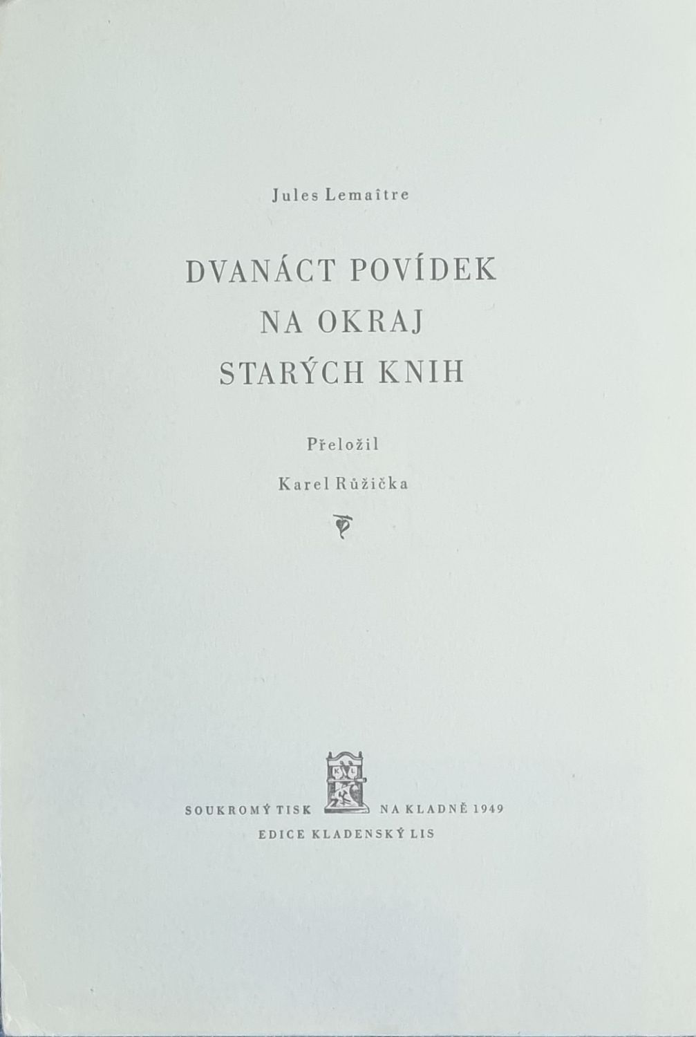 Ex. č. 45 z 99 vydaných, které na ručním lisu vytiskl a typograficky upravil Josef Cipra z písma cicero Fournier na ruční Maršovský papír. Přeložil Karel Růžička, V tiráži je uvedeno datum 1949, ve skutečnosti kniha byla vytištěna v lednu roku 1952. V tiráži podpis překladatelův. Červeno-černě tištěný titulní list.<br>Původní papírová obálka s chlopněmi, ve které jsou volně vložené složené tiskové archy. Ve stavu intaktním.