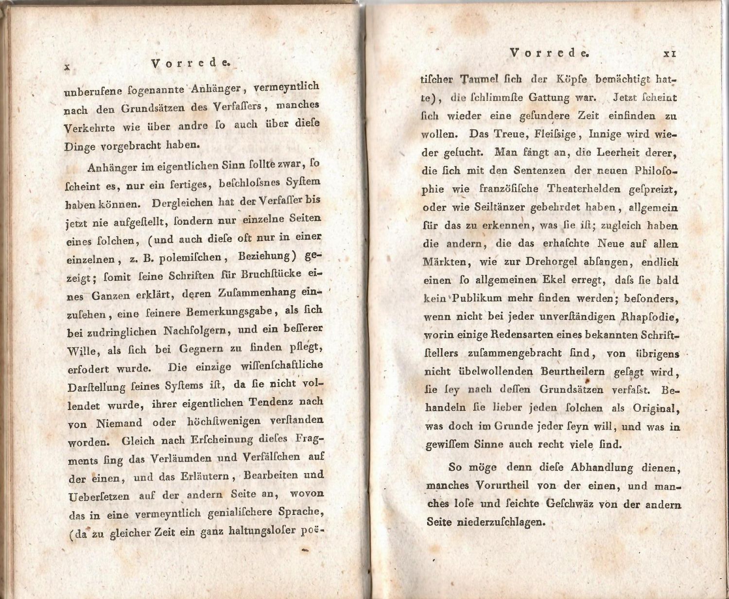 Goedecke V,27,12,19<br>Tištěno antikvou, tištěné poznámky pod čarou. V úvodu autorova předmluva datovaná 31. 3. 1809 v Mnichově, napsaná pro toto zamýšlené vydání sebraných spisů (vyšel však pouze I. díl), následuje autorova předmluva k 1. vydání díla "Vom Ich als Princip der Philosophie ...." datovaná v Tübingenu roku 1795, za ní na straně 1-114 výše zmíněná práce, na straně 115 mezi titul "Philosophische Briefe über Dogmatismus und kriticismus", na straně 201 mezi titul "Abhandlungen zur Erläuterung des Idealismus der Wissenschaftslehre", na straně na str. 341 "Ueber das Verhältniß der bildenden Künste zu der Natur", na straně 397 "Philosophische Untersuchungen über das Wesen der menschlichen Freyheit" (prvé vydání, práce vyšla samostatně poprvé tiskem až roku 1834 nákladem autorovým).<br>Dobová kartonová vazba, ve hžbetu ve druhém poli dobový kožený štítek s tlačeným názvem, ve čtvrtém poli vyznačení dílu. Barvené ořízky, vazba ohmataná a místy lehce odřená. Na hlavním titulním listu dvě vyříznutá místa, pravděpodobně s razítky, či proveniencí. Papír místy zahnědlý, na několika listech drobné hnědé skvrny. V textu tu a tam tužkou podtrháváno a na několika místech drobné poznámky tužkou se vztahem k textu.