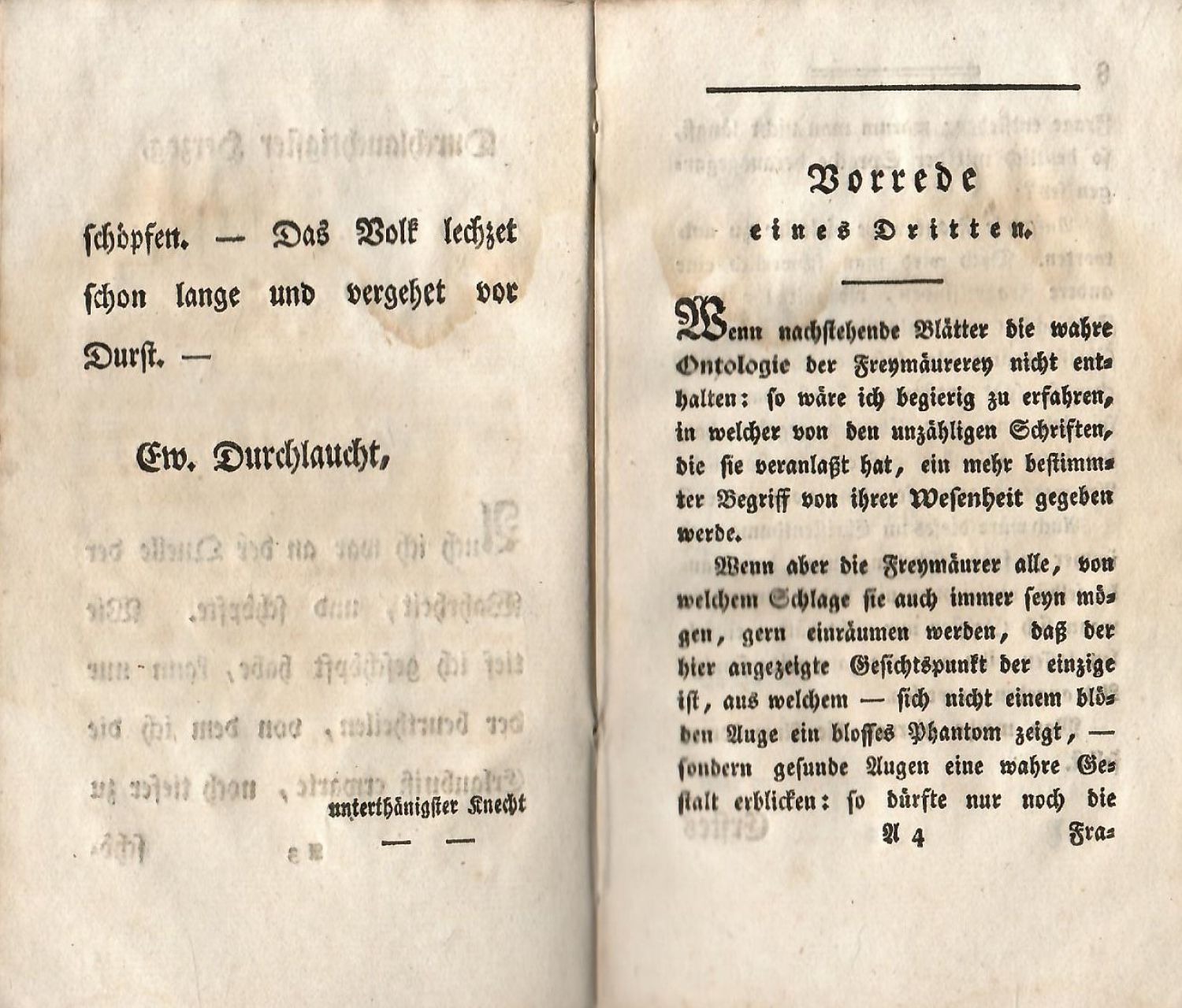 Wolfstieg 1373<br>Tištěno švabachem, uprostřed horního okraje stran dvojitá mizící linka. Prvá knížka obsahuje 1-3 rozhovor a na tit. listu je vytištěno II. vydání, Wolfenbüttel 1781; druhá kniha obsahuje 4-5 rozhovor, na tit. listu je oproti svazku prvnímu ještě dotištěno "Fortsetzung" a datace 1780, bez místa tisku. <br>Prvá kniha je v dobové obálce ze škrobového papíru, přes spodní okraj hřbetu přelepen pap. kni. štítek, na tit. listu staré razítko zednářské lóže "Friedrich Wilhelm zum eisernen Kreuz Bonn". Pap. obálka a knižní blok lehce zvlněný. Druhá kniha je v dobové kartonové vazbě potažené mramorovaným papírem, přes spodní okraj hřbetu přelepený pap. knih. štítek s číslem, na tit. listu staré razítko zednářské lóže "St. Johannis zur gekroenten Schlange" ve Zhořelci. Červeně barvené ořízky.<br>Theodor Ephraim Lessing (22.1. 1729 Kamenec - 15.1. 1781 Brunšvik) od roku 1771 byl členem zednářské lóže "Zu den drei Goldenen Rosen" v Hamburku.