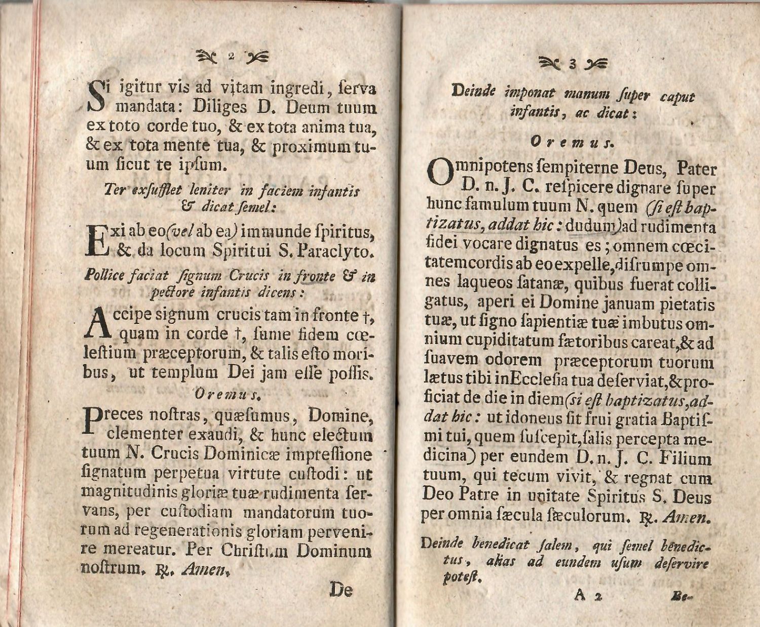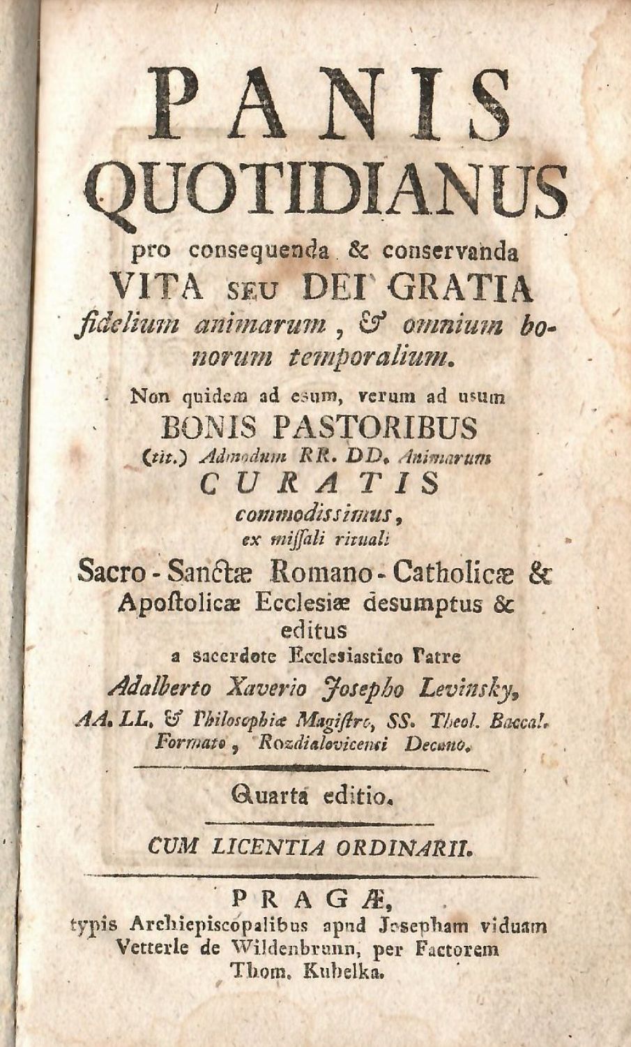 Latinský text antikvou, německý a český gotikou, tučně tištěné versálky ve výši 2 řádků, arabská paginace stran uprostřed horního okraje mezi drobnými lístky, ozdobné i jednoduché linky, vstupní vlys z rostlinného ornamentu.<br>Dobová vazba z temně hnědé hověziny, hřbet dělený ozdobnou lištou do šest polí, ve druhém a čtvrtém poli původní světlé kožené štítky, první s tlačeným názvem, ve druhém tlačený ornament, stejný jako v polích zbývajících, červeně barvené ořízky, na přídeštích a předsádkách dobový škrobový papír. <br>Vojtěch František Josef Levinský (9.4.1682 Chlumec nad Cidlinou - 9.4.1768), magistr filosofie a svobodných umění, bakalář bohosloví, od roku 1718 děkan v Rožďalovicích nad Trnavou.