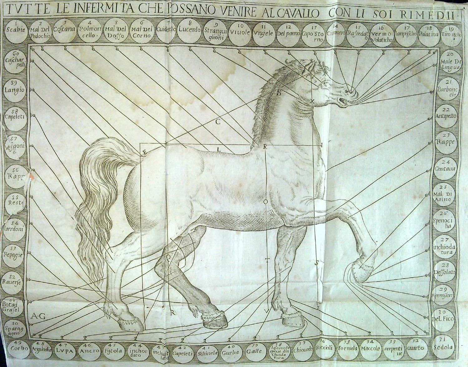 | Ilustrace: | Mezi stranou 78-79 rozkládací mědiryt. příloha se schematickým vyobrazením koně (275 x 370 mm), v rámu v kulatých medailonech vyjmenovaných 60 druhů neduhů, které mohou koně postihnout. |