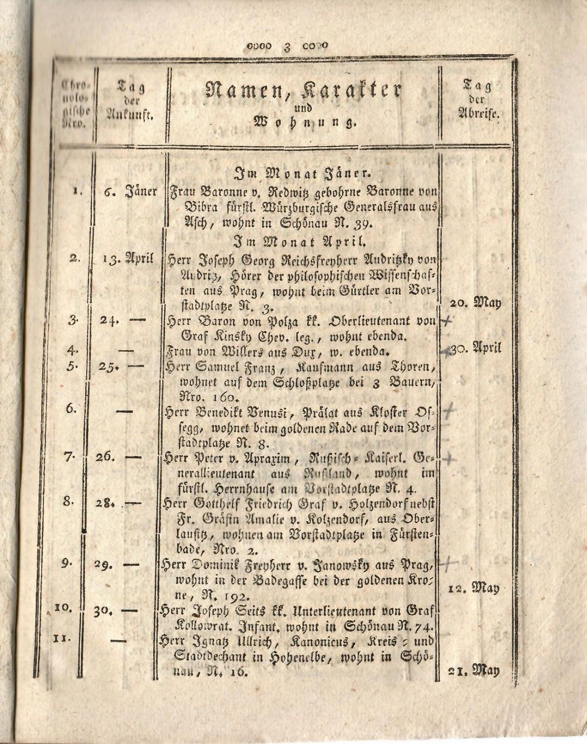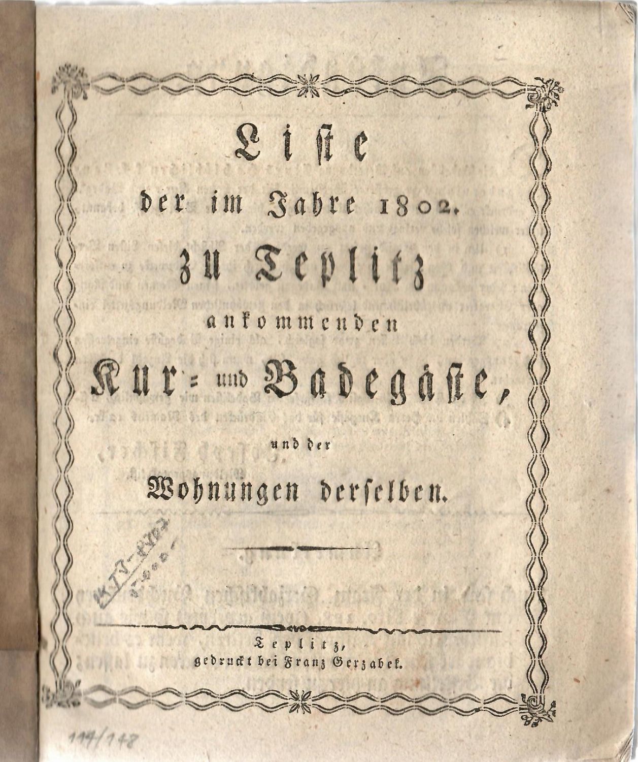 Liste der im Jahre 1802. zu Teplitz ankommenden Kur = und Badegäste, und der Wohnungen derselben.